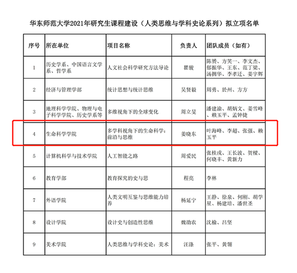 近日,研究生院公示了华东师范大学2021年研究生课程建设项目拟立项名单,经相关课程负责人申请、学部院系推荐,研究生院组织专家评审,我院研究生“人类思维与学科史论”课程《多学科视角下的生命科学:前沿与思维》获批立项。