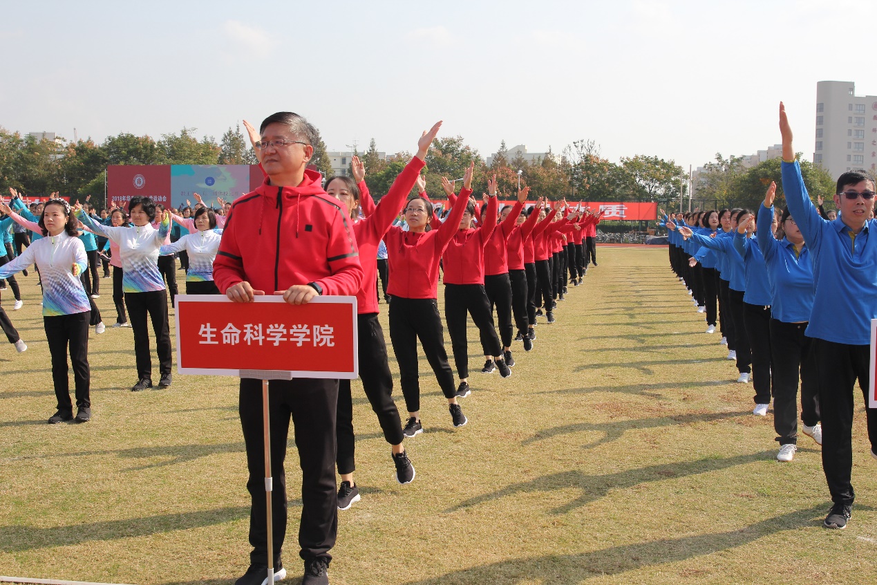 开幕式上,彩旗飘扬。生科院常务副院长王群教授作为领队带领教职工老师们身着统一服装,迈着整齐步伐进入赛场,院党委书记房建军老师也特地到现场为老师们加油鼓舞打气。在第九套广播操激昂欢快的音乐声中,老师们或挥动手臂,或踢腿弯腰,或击掌跳跃,他们全神贯注,动作规范,用平时认真工作的劲头,努力做好每一个动作,成功卫冕广播操比赛最佳表演奖。本次运动会活动丰富,充满趣味性。在篮球定点投篮比赛中,生命科学学院教职工代表团表现出色,由“优青”获得者罗剑教授和李大力教授共同领衔的参赛队伍荣获三等奖;在4×400米混合接力赛中,由罗剑教授领衔组成的生生不息队不畏强敌,积极拼搏,表现突出,取得了小组团队第一的好成绩;跳短绳比赛中,赛况激烈,在生科院党委副书记兼副院长、工会主席徐敏华老师的带领下,教职工们奋勇争先,脱颖而出最终获得跳短绳比赛三等奖。