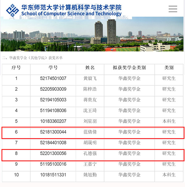“华鑫专项”奖学金评选从2021年开始,该奖学金适用于华东师范大学普通全日制在校学生。在经学生个人申请、评审委员会初审、现场答辩及奖学金管理委员会审核后,我院博士研究生范倩倩和孔德强最终荣获“华鑫专项”奖学金。