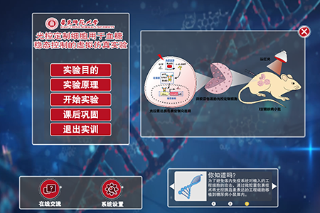 “光控定制细胞用于血糖稳态控制的虚拟仿真实验”展示了如何通过合成生物学和光遗传学的方法设计、构建光控基因表达环路,获得光控胰岛素表达的工程细胞,并将改工程细胞移植到糖尿病模型小鼠,从而实现光照控制血糖稳态的目的。该实验借助虚拟仿真技术,摆脱了传统的以教师讲授为主的教学方式,在探究式操作的引导下,引导和鼓励学生自主学习,并通过循序渐进的教学环节设计,逐步加深学生对合成生物学相关知识的掌握。辅以真实实验操作的教学视频,虚实结合,促进理解。以剧情的形式贯穿整个实验,引导学生思考。整个实验以合成生物学领域科技前沿为蓝本,采用多学科交叉融合手段,在实验设计上环环相扣,涵盖了基因工程、细胞工程、细胞治疗、药物递送等多学科技术手段,有助于培养学生多学科交叉的思辨能力,提升学生的科研思维以及科学素养。