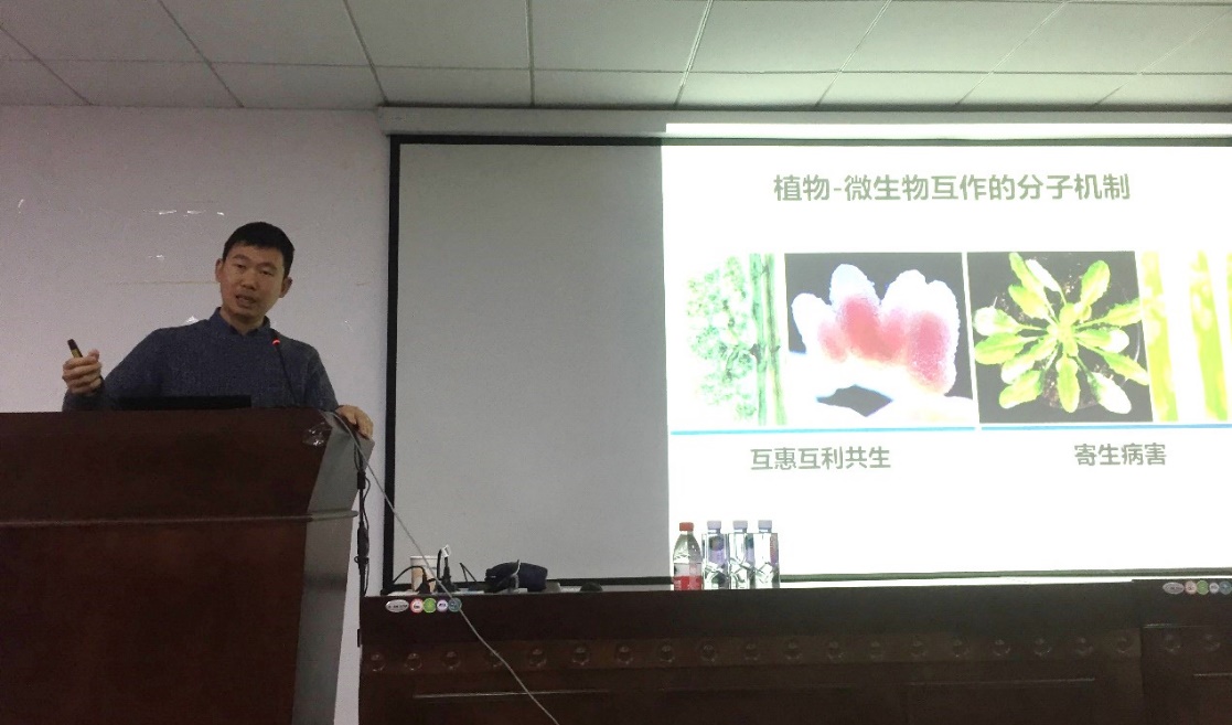 粮食与环境问题是关系到人类生存与发展的重大问题,为解决全球“粮食危机”,人们不断开垦土地、施肥用药,由此造成的环境恶化及污染日益加重。如何在保持粮食较高产量的同时减少环境污染,是农业可持续发展所面临的重要问题之一。植物生长发育的过程中,收到根际微生物的影响,与其形成共生或寄生关系。基于遗传学、生物化学、细胞生物学等学科,研究植物与微生物的共生互动关系,有助于在提高粮食产量的同时,减少化肥的使用。报告中,王二涛研究员以生动有趣的事例解读了典型的豆科植物-根瘤细菌及陆生植物-菌根真菌共生的概念。其中,详细介绍了植物与微生物共生关系中的特异性“交流”:即植物在与微生物相互识别的过程中,都会产生特异的信号分子,如:植物释放类黄酮刺激根瘤菌释放结瘤因子(Nod Factor),进而又被植物所识别;植物释放独角金素内酯刺激丛枝菌根产生LCOs等菌根因子(Myc Factor)被植物识别后,启动下游一系列共生相关基因的表达。随后,王二涛研究员基于这种共生关系,谈到其在玉米、小麦和水稻等重要粮食作物上的应用前景。希望通过遗传改造的方式,建立起非豆科植物的根瘤共生体系,以增强植物对养分和水分的利用效率,从而提高粮食供应水平。