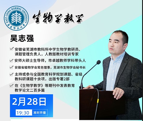 2025年2月28日晚,由华东师范大学《生物学教学》杂志主办的“中学生物学教师素养提升公益直播”如期开讲。本次直播特邀安徽省芜湖市教育科学研究所中学生物学教研员、人教版教材培训专家、安徽师范大学硕士生导师吴志强教授,以“生物学作业设计与命题实践”为主题,深度解析作业设计的育人价值、学科框架及命题策略。直播吸引了全国3300余名生物学教师在线学习,互动热烈。本次直播由《生物学教学》杂志常务副主编李增娇老师主持。