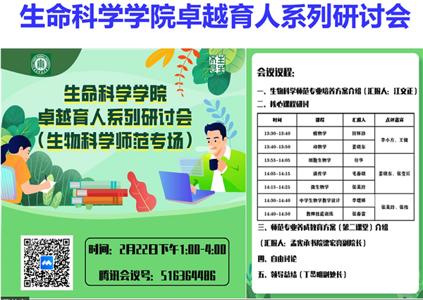 为了切实推进卓越育人工作,落实《华东师范大学关于开展卓越育人工作的通知》以及教育部高等教育教学评估中心印发的《普通高等学校师范类专业认证状态保持监控办法(试行)》,加快推进建立新的课程规范和体系,生命科学学院于2021年2月22日下午在线上召开了卓越育人系列研讨会——生物科学(师范专业)专场。生命科学学院全体党政班子成员、教学委员会全体委员、任课教师近60位老师参加了会议,这也是生科院关于本科教学卓越育人工作的第二场专题讨论会。参加本次会议的还有学校教务处丁旵明老师、吴平颐老师、黄鲁霞老师、姚如佳老师,孟宪承书院梁宏亮老师及辅导员老师,生命医学教工第二党支部的全体党员教师也参与了此次研讨。