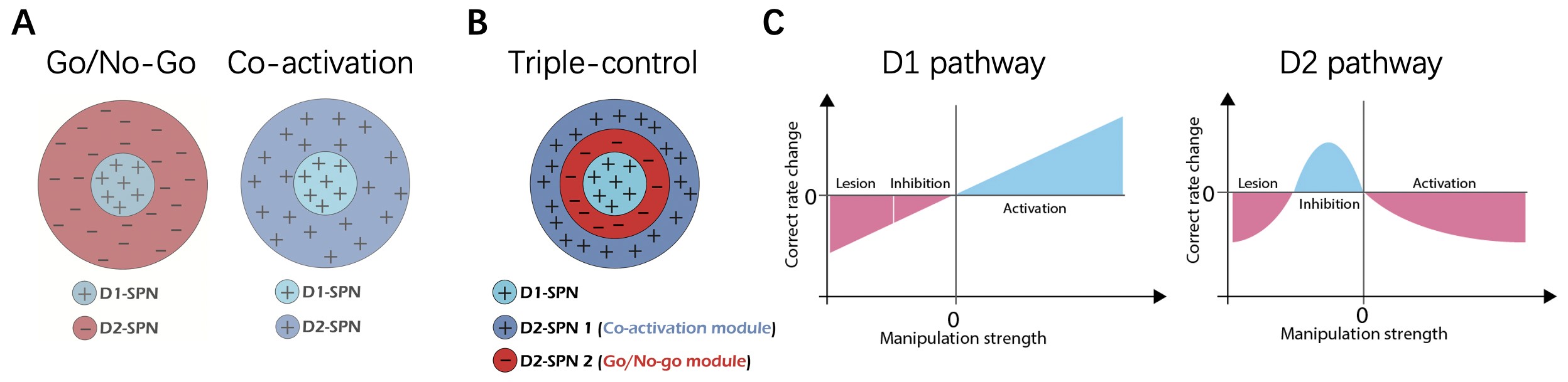 在时刻变化的环境中,选择正确的行动对动物的生存和繁殖至关重要。基底神经节是一系列相互连接的皮层下核团,包括纹状体和黑质,大量研究表明它们在动作选择中发挥着主要作用。临床上,包括帕金森病、亨廷顿病、强迫症等众多神经和精神疾病都与基底神经节环路功能失调相关,其共同特点是动作选择和运动控制方面存在重大缺陷。解剖学上,基底神经节通过直接和间接通路两条主要途径来控制运动,其分别源自纹状体中表达 D1 和 D2 受体的多刺投射神经元。教科书经典理论认为基底神经节直接和间接通路相互对立,分别促进和抑制目标运动(“Go/No-go”,“去留”模型)。然而,近年来领域内有不同观点,认为直接通路选择目标行动,而间接通路抑制其它竞争行为以加强目标选择,两通路并非对立而是促进关系(“Co-activation”,“共激活”模型)。