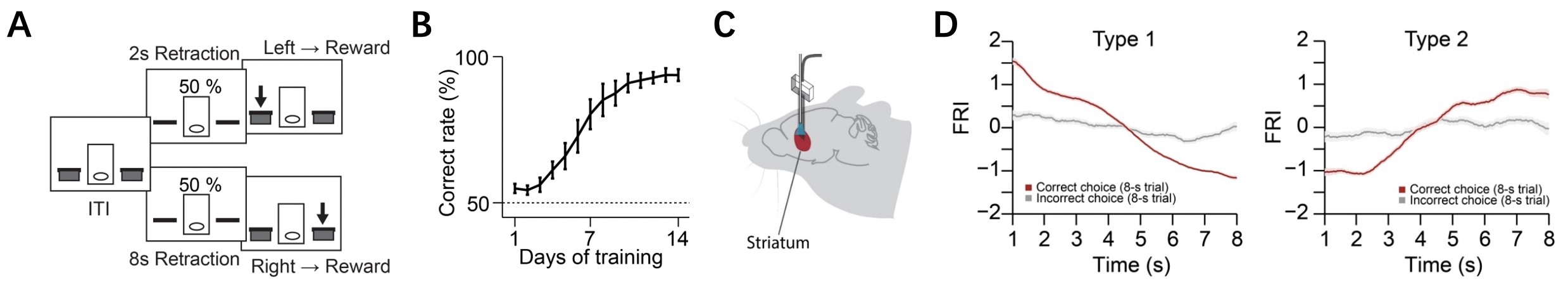 图1. 小鼠基于时间间隔长短而作相应行为抉择的行为范式及相关神经元活动