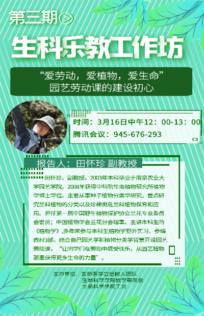 学院田怀珍老师的《爱劳动,爱植物,爱生命》园艺劳动课程入选校级首批劳动教育精品课程建设项目。在报告中,田老师介绍了园艺劳动对学生专业素质的培养、生活常识的提高和心理需求的建设上的积极作用,并对该课程的建设计划和申报要求进行了分享。
