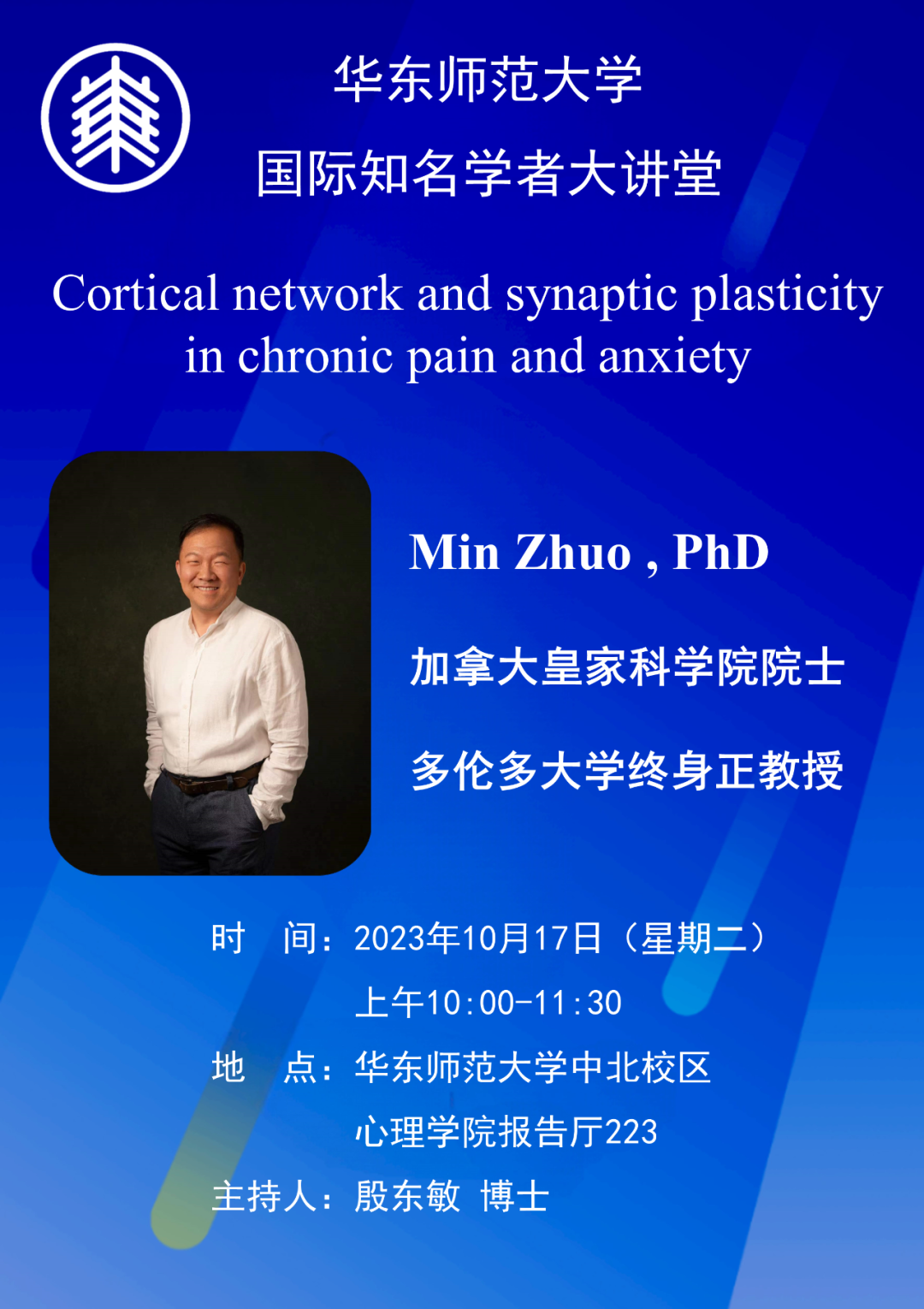 Min Zhuo(卓敏),加拿大皇家科学院院士,多伦多大学生理系终身正教授,EJLB基金会和加拿大国立研究院第一届及神经科学领域惟一的特聘教授 (Smith Chair in Neuroscience, EJLB-CIHR)和加拿大国家特聘研究教授(Canada Research Chair, Tiger I)。他是第一份Online国际性痛觉研究杂志Molecular Pain主编和Molecular Brain的Founding 主编。他当任2004年中国科学院海外学者专家评审团成员, 2005-present 中国国家自然科学基金委海外评审主持人之一。他是王宽诚访问学者, Pfizer 公司痛觉生物学科学咨询委员会成员。他主编了第一本分子痛的英文教科书由国家高等教育出版社和Springer联合出版。他在国际权威杂志如Nature,Science,Neuron,Nature Neurosci,Nature communication, Cell report, J Neurosci等杂志上发表研究论文300余篇, 在影响因子10分以上杂志发表文章30余篇,影响因子30分以上发表文章8篇。综述30篇。