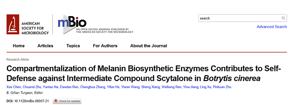 2021年3月23日,华东师范大学生命科学学院许玲教授课题组在微生物领域顶级刊物《mBio》上发表题为Compartmentalization of melanin biosynthetic enzymes contributes to self-defense against intermediate compound scytalone in Botrytis cinerea的研究论文,揭示了灰霉菌黑色素生物合成关键酶的区室化分布作用机制。华东师大为论文的唯一完成单位,生命科学学院博士研究生陈雪、硕士研究生朱传玺和那艳涛为论文的共同第一作者,朱品宽副教授为论文的共同通讯作者。该研究得到了国家十三五重点研发计划项目(2016YFD0400105)和国家自然科学基金(32061133006, 31571902, 31972121)的资助。(全文链接:)