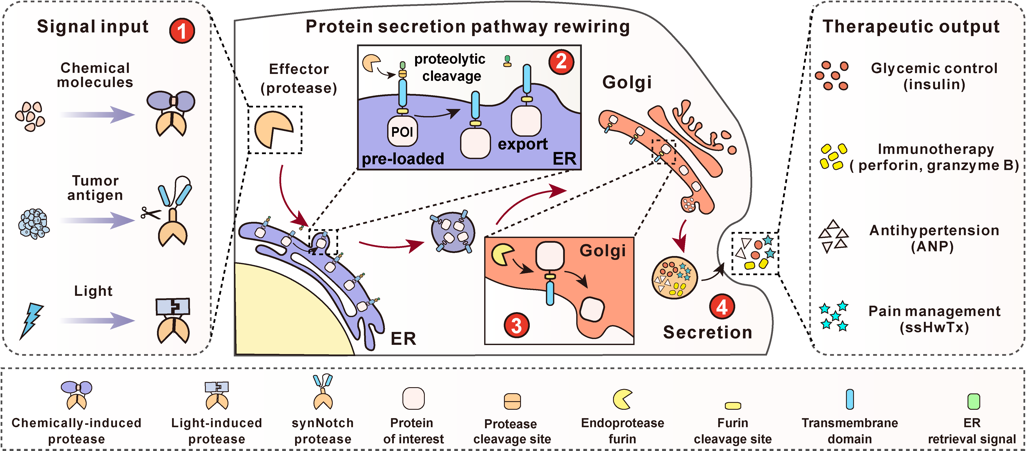 为解决上述人工定制细胞‘开机’缓慢的问题,华东师范大学生命科学学院、上海市调控生物学重点实验室、医学合成生物学研究中心叶海峰研究团队通过重编程蛋白质分泌途径,开发了一个精准可控的蛋白质快速释放技术平台PASS系统,实现了蛋白药物分钟级别的可控释放。这一创新成果“A programmable protease-based protein secretion platform for therapeutic applications”于2023年10月23日发表在国际期刊Nature Chemical Biology