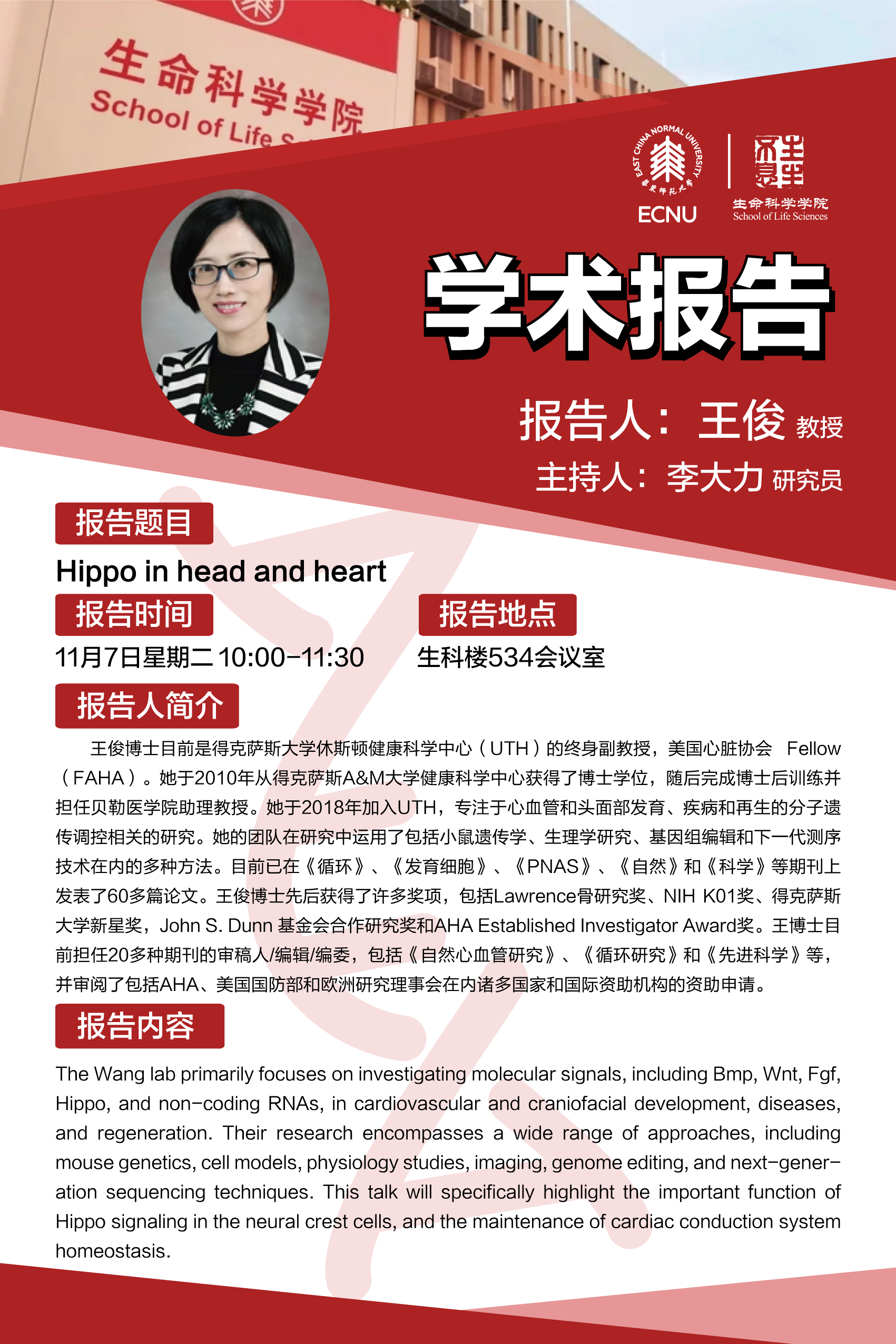 王俊博士目前是得克萨斯大学休斯顿健康科学中心(UTH)的终身副教授,美国心脏协会 Fellow(FAHA)。她于2010年从得克萨斯A&M大学健康科学中心获得了博士学位,随后完成博士后训练并担任贝勒医学院助理教授。她于2018年加入UTH,专注于心血管和头面部发育、疾病和再生的分子遗传调控相关的研究。她的团队在研究中运用了包括小鼠遗传学、生理学研究、基因组编辑和下一代测序技术在内的多种方法。目前已在《循环》、《发育细胞》、《PNAS》、《自然》和《科学》等期刊上发表了60多篇论文。王俊博士先后获得了许多奖项,包括Lawrence骨研究奖、NIH K01奖、得克萨斯大学新星奖,John S. Dunn 基金会合作研究奖和AHA Established Investigator Award奖。王博士目前担任20多种期刊的审稿人/编辑/编委,包括《自然心血管研究》、《循环研究》和《先进科学》等,并审阅了包括AHA、欧洲研究理事会在内诸多国家和国际资助机构的资助申请。