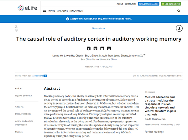 4月29日,《eLife》期刊在线发表了题为《听皮层在听觉工作记忆中的作用》的研究论文,该论文由华东师范大学生命科学学院神经生物学/生理学专业许兢宏、俞黎平课题组完成,俞黎平副教授、硕士研究生胡家玮、史晨琳为论文共同第一作者,许兢宏副教授为论文的通讯作者。