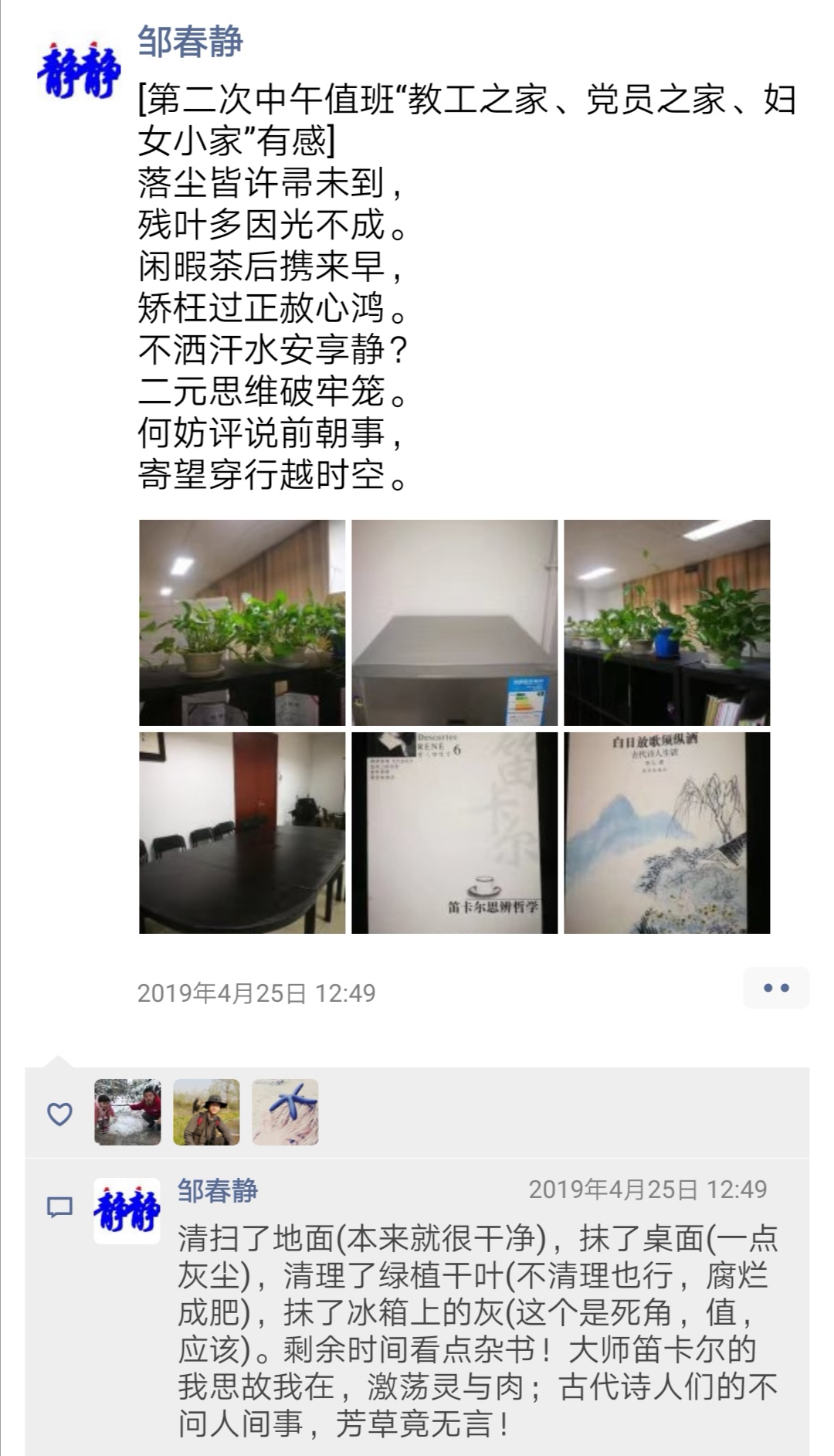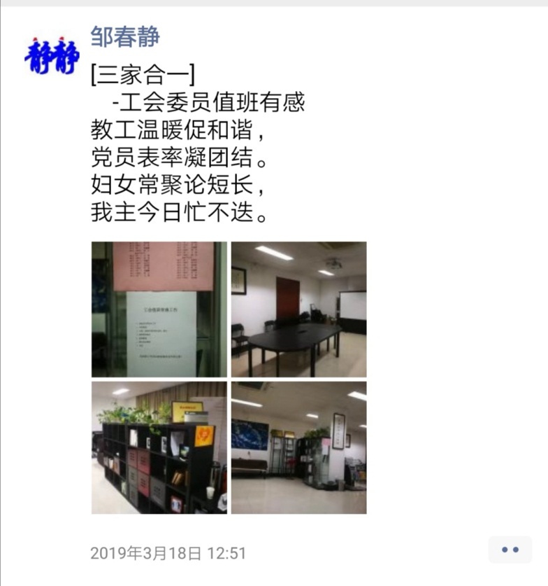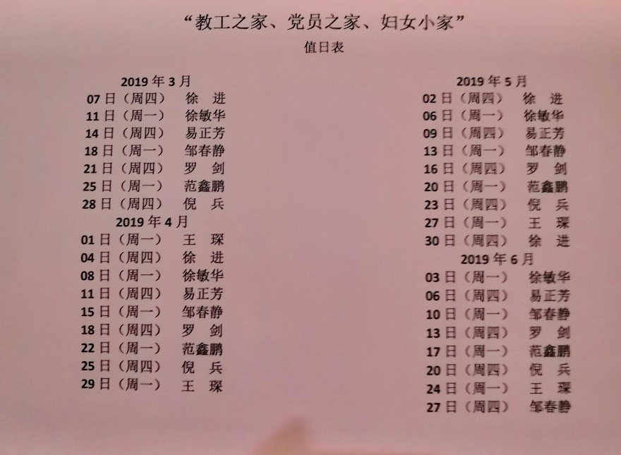 “家”共十笔,“十”在中国文化中是个代表圆满的数字,所谓“十全十美”,而一个家要想十全十美,就不能不用心经营和呵护。生科院的工会委员们,包括学院党委副书记兼副院长、工会主席徐敏华副教授,副主席兼青年教师联谊会会长罗剑教授,易正芳教授,高级工程师倪兵,邹春静副教授,范鑫鹏副研究员,研究生教务徐进和辅导员王琛, 他们为了维护好自己的“小家”自发提出执行值班制度,并且亲自参与其中。据悉,这是开启了华东师范大学“教工小家”教授值班的先河。在“教工小家”的门口可以看到一张非常详尽的值日表,上面罗列了每周的值班安排。