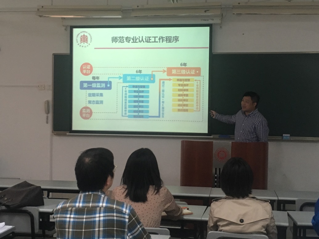 首先,江文正老师传达了《教育部关于狠抓新时代全国高等学校本科教育工作会议精神落实的通知》精神,并指出在学风教风建设成果的基础上,严格过程管理,紧紧抓住核心环节,构建振兴本科的长效机制和制度保障。与此同时,围绕师范专业认证,江老师向各位老师解读了师范专业认证标准,介绍了师范专业认证工作的重要意义及相关工作安排。师范专业认证将以学生发展为中心,以培养目标和毕业要求为导向,通过课程与教学、合作与实践、师资队伍和支持条件等方面进行支撑,并形成强有力的质量保障体系,进而实现培养什么样的人,如何培养人。最后,为了按时保质推进师范专业认证工作,江文正老师明确了各必修课程负责人的工作要点和时间节点,并就自评报告的撰写、课程大纲的修订和课程目标达成情况的评价方法等进行了说明。