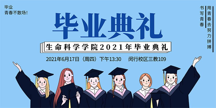 生命科学学院2021年毕业典礼,将于2021年6月17日(周四)下午13:30,在闵行校区三教109举行。诚挚邀请各位老师和毕业生同学参加,感念师恩,共话青春! 生命科学学院