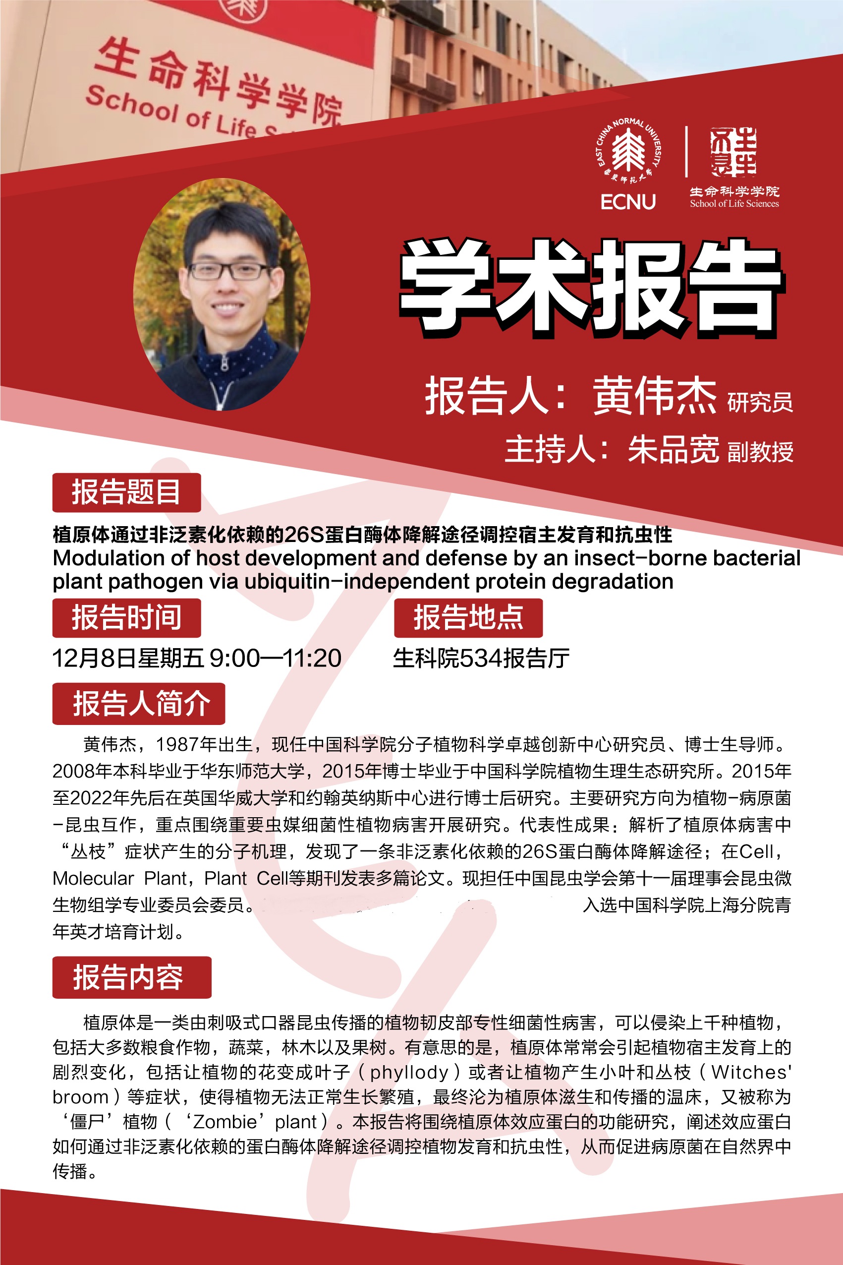 黄伟杰 ,1987年出生,现任中国科学院分子植物科学卓越创新中心研究员、博士生导师。2008年本科毕业于华东师范大学,2015年博士毕业于中国科学院植物生理生态研究所。2015年至2022年先后在英国华威大学和约翰英纳斯中心进行博士后研究。主要研究方向为植物-病原菌-昆虫互作,重点围绕重要虫媒细菌性植物病害开展研究。代表性成果:解析了植原体病害中“丛枝”症状产生的分子机理,发现了一条非泛素化依赖的26S蛋白酶体降解途径;在Cell,Molecular Plant,Plant Cell等期刊发表多篇论文。现担任中国昆虫学会第十一届理事会昆虫微生物组学专业委员会委员。入选中国科学院上海分院青年英才培育计划。