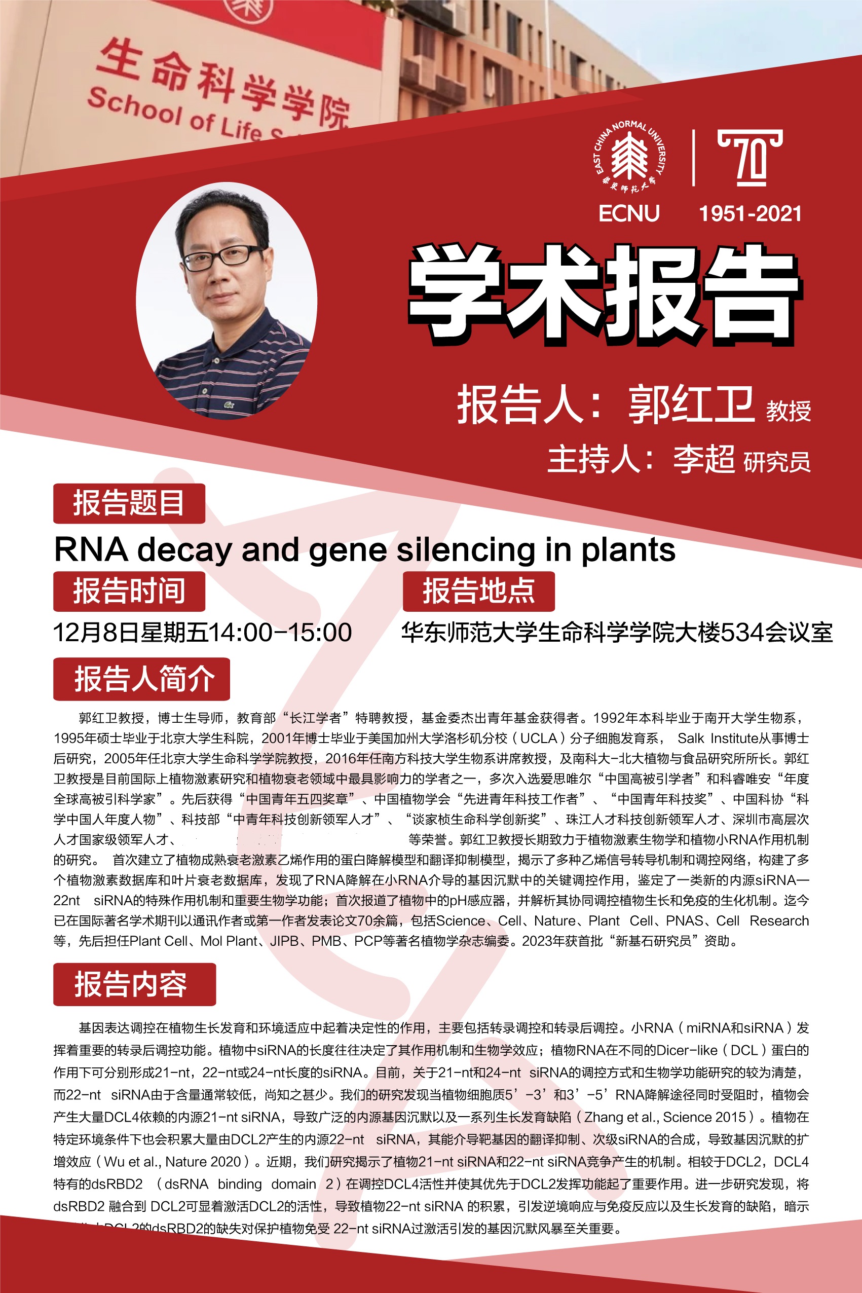 郭红卫教授,博士生导师,教育部“长江学者”特聘教授,基金委杰出青年基金获得者。1992年本科毕业于南开大学生物系,1995年硕士毕业于北京大学生科院,2001年博士毕业于美国加州大学洛杉矶分校(UCLA)分子细胞发育系, Salk Institute从事博士后研究,2005年任北京大学生命科学学院教授,2016年任南方科技大学生物系讲席教授,及南科大-北大植物与食品研究所所长。郭红卫教授是目前国际上植物激素研究和植物衰老领域中最具影响力的学者之一,多次入选爱思唯尔“中国高被引学者”和科睿唯安“年度全球高被引科学家”。先后获得“中国青年五四奖章”、中国植物学会“先进青年科技工作者”、“中国青年科技奖”、中国科协“科学中国人年度人物”、科技部“中青年科技创新领军人才”、“谈家桢生命科学创新奖”、珠江人才科技创新领军人才、深圳市高层次人才国家级领军人才等荣誉。郭红卫教授长期致力于植物激素生物学和植物小RNA作用机制的研究。 首次建立了植物成熟衰老激素乙烯作用的蛋白降解模型和翻译抑制模型,揭示了多种乙烯信号转导机制和调控网络,构建了多个植物激素数据库和叶片衰老数据库,发现了RNA降解在小RNA介导的基因沉默中的关键调控作用,鉴定了一类新的内源siRNA—22nt siRNA的特殊作用机制和重要生物学功能;首次报道了植物中的pH感应器,并解析其协同调控植物生长和免疫的生化机制。迄今已在国际著名学术期刊以通讯作者或第一作者发表论文70余篇,包括Science、Cell、Nature、Plant Cell、PNAS、Cell Research等,先后担任Plant Cell、Mol Plant、JIPB、PMB、PCP等著名植物学杂志编委。2023年获首批“新基石研究员”资助。
