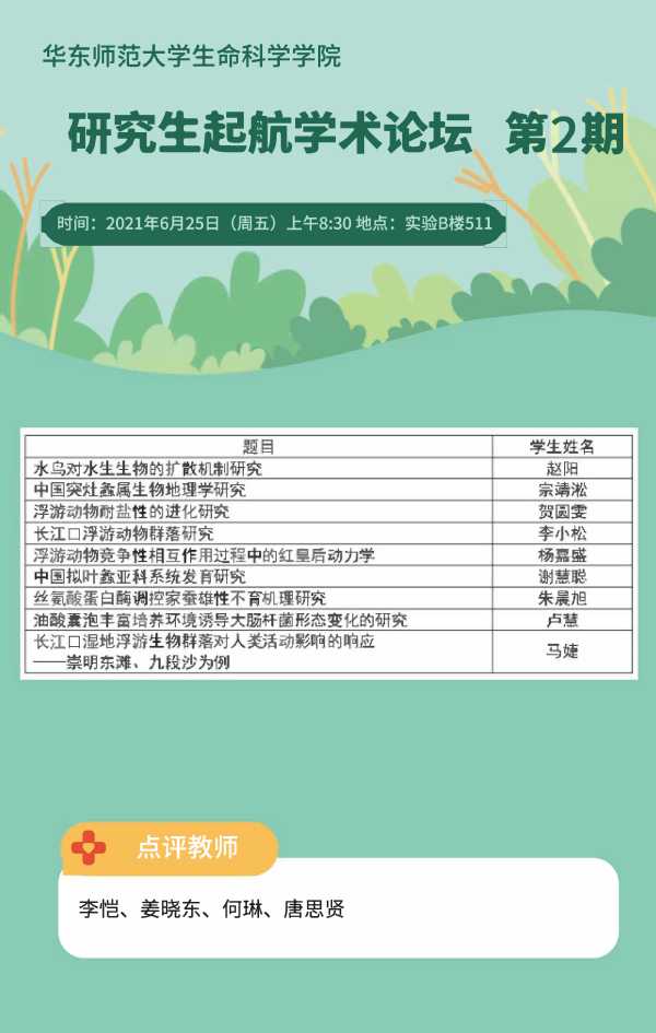 为进一步提高研究生学位论文水平,保证学位论文质量,促进院系间的沟通交流,华东师范大学生命科学学院研究生起航学术论坛系列活动将不定期更新