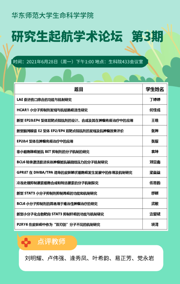 为进一步提高研究生学位论文水平,保证学位论文质量,促进院系间的沟通交流,华东师范大学生命科学学院研究生起航学术论坛系列活动将不定期更新