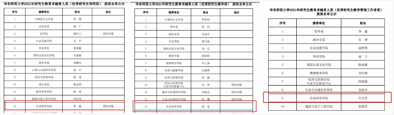 近日,研究生院公示了华东师范大学2021年研究生教育卓越育人奖获奖名单,经个人申报、学部院系推荐、研究生院组织最终评审,我院三位教师及团队荣获研究生教育卓越育人奖,其中李超研究员团队荣获优秀研究生导师奖,钱旻教授荣获优秀研究生教学奖,石玉帛老师荣获优秀研究生教育管理工作者奖。