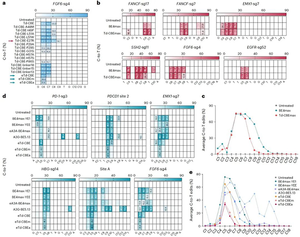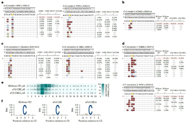 最后,为了无偏见地分析eTd-CBEs的精准编辑特性,该研究采用含有8954条sgRNA与靶点配对的文库进行编辑窗口的分析,发现eTd-CBEm非常精准且无序列偏好地主要编辑C5位碱基,证明其广泛地精准编辑特性(图4)。由于其无编辑序列偏好,因此将来还可以与识别不同PAM的Cas蛋白变体融合,进一步扩大靶向范围。