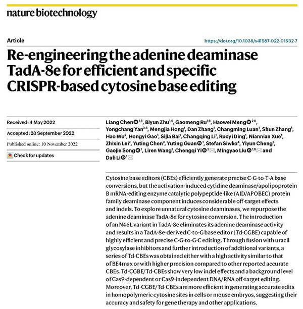 研究成果以题为Re-engineering the adenine deaminase TadA-8e for efficient and specific CRISPR-based cytosine base editing的研究论文在Nature Biotechnology杂志上发表。