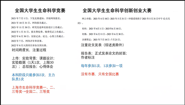 随后,何祝清老师详细地介绍了我校创新创业训练计划项目及全国大学生生命科学竞赛。首先何老师指出,导师是我们参加科研的基本保证,并就如何找到导师这个问题进行了详细解答。第一个途径是进入生科院官网查看导师信息,而第二个途径是每年开学由生科院组织统计的导师需求表。之后何老师详细地介绍了我校创新创业训练计划项目及全国大学生生命科学竞赛的立项、中期、结项时间节点以及具体的参赛流程与注意事项,并展示了往届学生的获奖证书。除此之外,何老师也指出了科创经验在保研中的加分情况,鼓励同学们进入实验室,参加大赛锻炼自己。