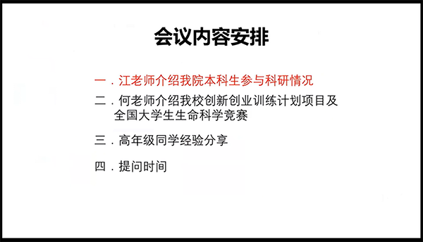 首先,江老师简单地介绍了生命科学学院历年来的本科生创新创业训练培育项目和生命科学竞赛的情况,并为大家讲解了往年的优秀案例。江老师强调道,本科生创新创业训练培育项目是一次非常好的锻炼同学们科研能力的项目,并且往年的许多同学都通过这个项目的锻炼,提升了自身的创新能力以及与实验室师兄师姐的交流能力。同时江老师指出,他认为我院的本科生不管是师范生还是非师范生,都应该参与到科创项目中去。