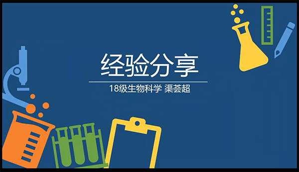 之后是渠荟超介绍了她在两年的实验室经历中的收获与建议。首先她强调了实验室的方向选择,并以自身的经历告诉同学们在选择实验室要综合考虑兴趣与校区。之后她分享了自己在两大竞赛中的经验与感受,她告诉同学们项目本身就可以锻炼我们参与科研的所有能力,比如在参与双创时要填报的立项申请书,中期申报表等,可以锻炼我们的文字表达与文献归纳能力。最后学姐以一句话结尾,勉励各位同学在科研的道路上前行。