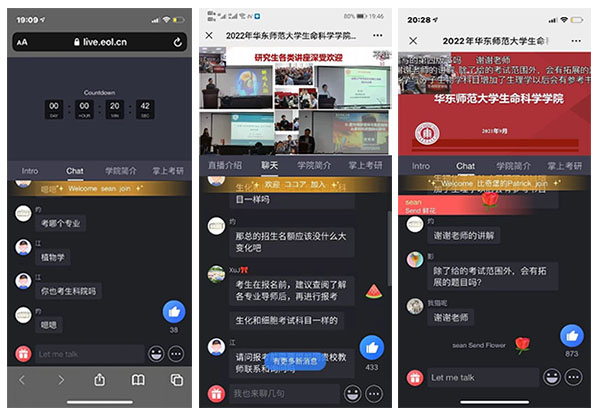 为满足后疫情时期考生对研招咨询的需求,为考生建立全方位的信息沟通渠道,2021年9月9日晚7点30分至8点30分,生命科学学院在校研招办的工作指导下,依托“中国教育在线·掌上考研”平台举办了直播宣讲会,由院长翁杰敏主讲,副院长姜晓东答疑,研究生秘书徐进和石玉帛参与线上答疑等。