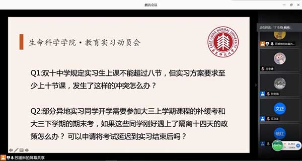 最后,栾瑞红老师基于今年疫情的特殊情况和往年学生实习的实例,为同学们详细讲解了教育实习的具体内容、注意事项和纪律。栾老师指出,教育实习是师范生从学生身份走向老师身份必不可少的一步,作为华东师范大学的学生,在实习期间既要遵守华师的校纪校规,还要遵守实习学校的教师准则,因为同学们不单单代表着自己,也代表着华东师范大学。