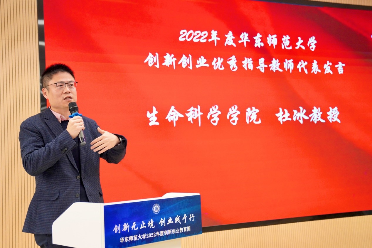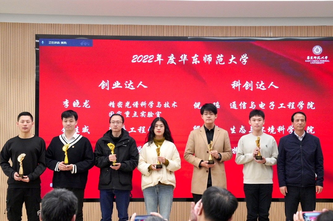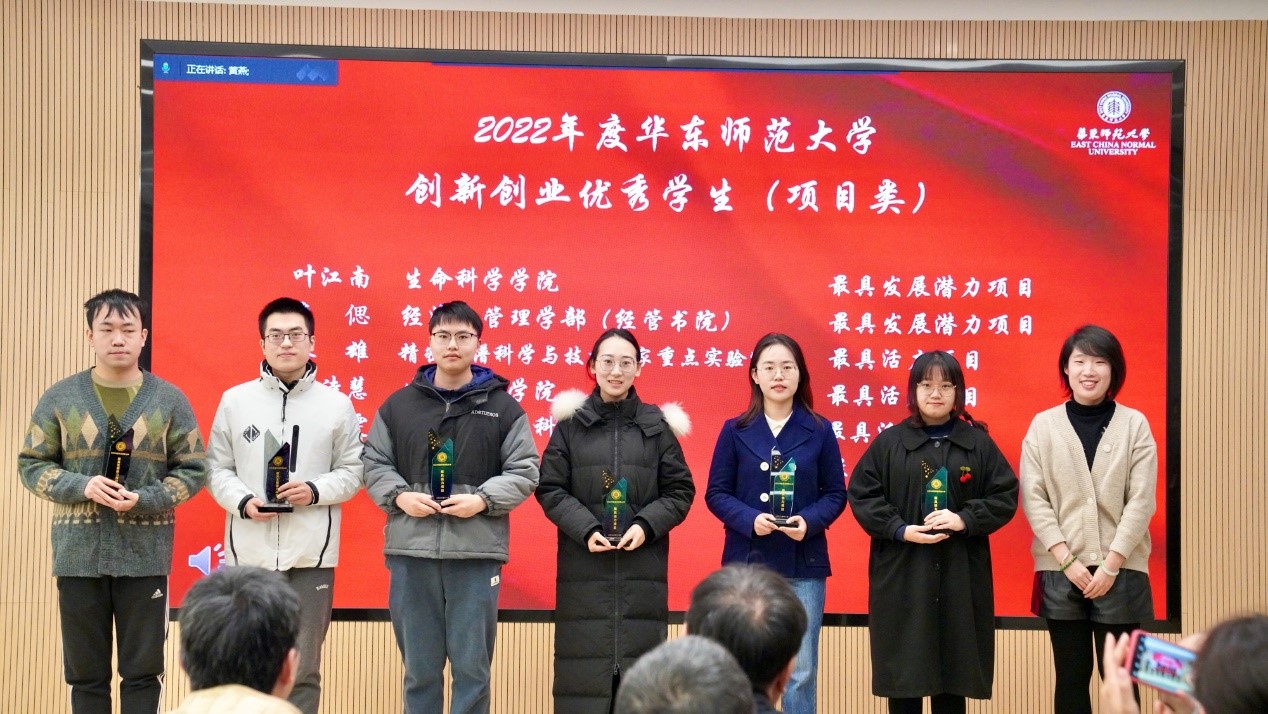 杜冰荣获“2022年度华东师大创新创业优秀指导教师”称号;刘小红获评“2022年度华东师范大学创业达人”;叶江南携“饵食饲安——无抗养殖引领者”项目获评“2022年度华东师范大学最具发展潜力项目”;沈诗慧携项目“S2Y85S1——靶向REGγ-20S蛋白酶体的新型抗肿瘤药物”获评“2022年度华东师范大学最具活力项目”。