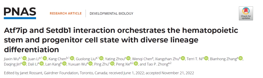 2022年12月28日,华东师范大学生命科学学院钟涛教授团队在国际知名期刊 PNAS 上,在线发表题了Atf7ip and Setdb1 interaction orchestrates the hematopoietic stem and progenitor cell state with diverse lineage differentiation 的研究论文。该工作应用发育生物学、表观遗传学及基因组学方法揭示了 ATF7IP/SETDB1 介导的组蛋白甲基化修饰是协调 HSPC 干细胞状态与多种血液谱系分化的一个关键检测点(CHECKPOINT),用于维持红系、髓系和淋巴系等多种细胞的平衡分化及血液系统的正常循环与功能。