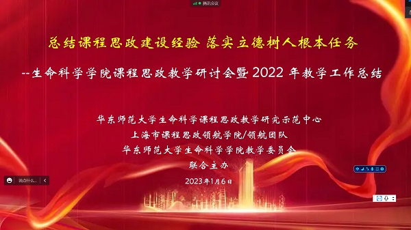 新年伊始,为了深入学习和全面贯彻党的二十大精神,更好落实高校教师立德树人根本任务,华东师范大学生命科学课程思政教学研究示范中心、上海市课程思政领航学院/领航团队、华东师范大学生命科学学院教学委员会联合主办了题为“总结课程思政建设经验 落实立德树人根本任务”的生命科学学院课程思政教学研讨会。学院60余位教师及新疆大学10余位教师在线参加教学研讨。