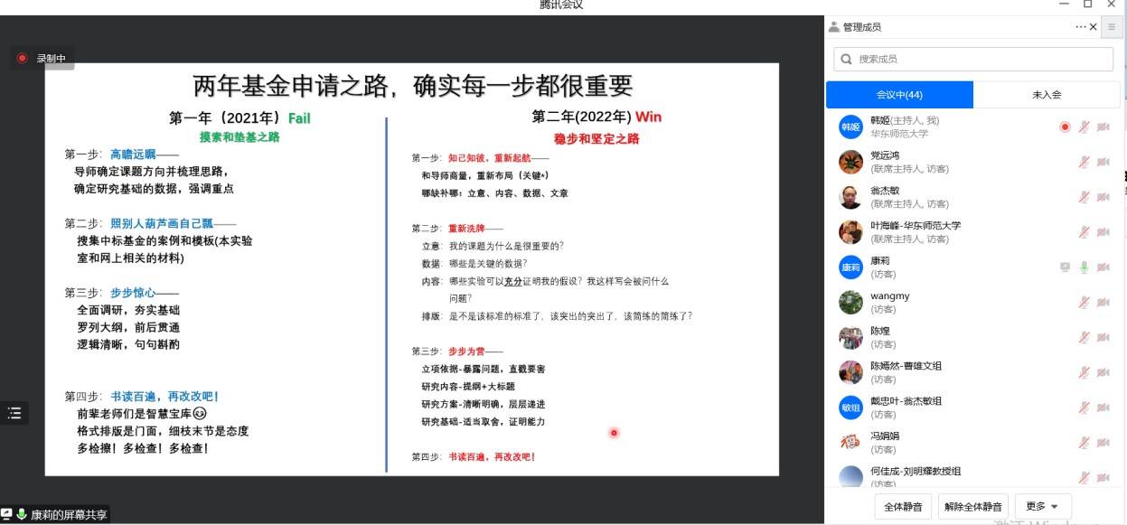 翁杰敏教授课题组博士后康莉则结合自己两次申报经历对比进行分享,强调一定要和导师确定课题方向并梳理思路,准确定位科学问题属性,多和导师讨论、多听有经验前辈的建议,确定研究基础数据,全面调研,夯实基础。康莉博士还分享了基金项目查询经验,鼓励大家要多了解领域动向,多深入思考。