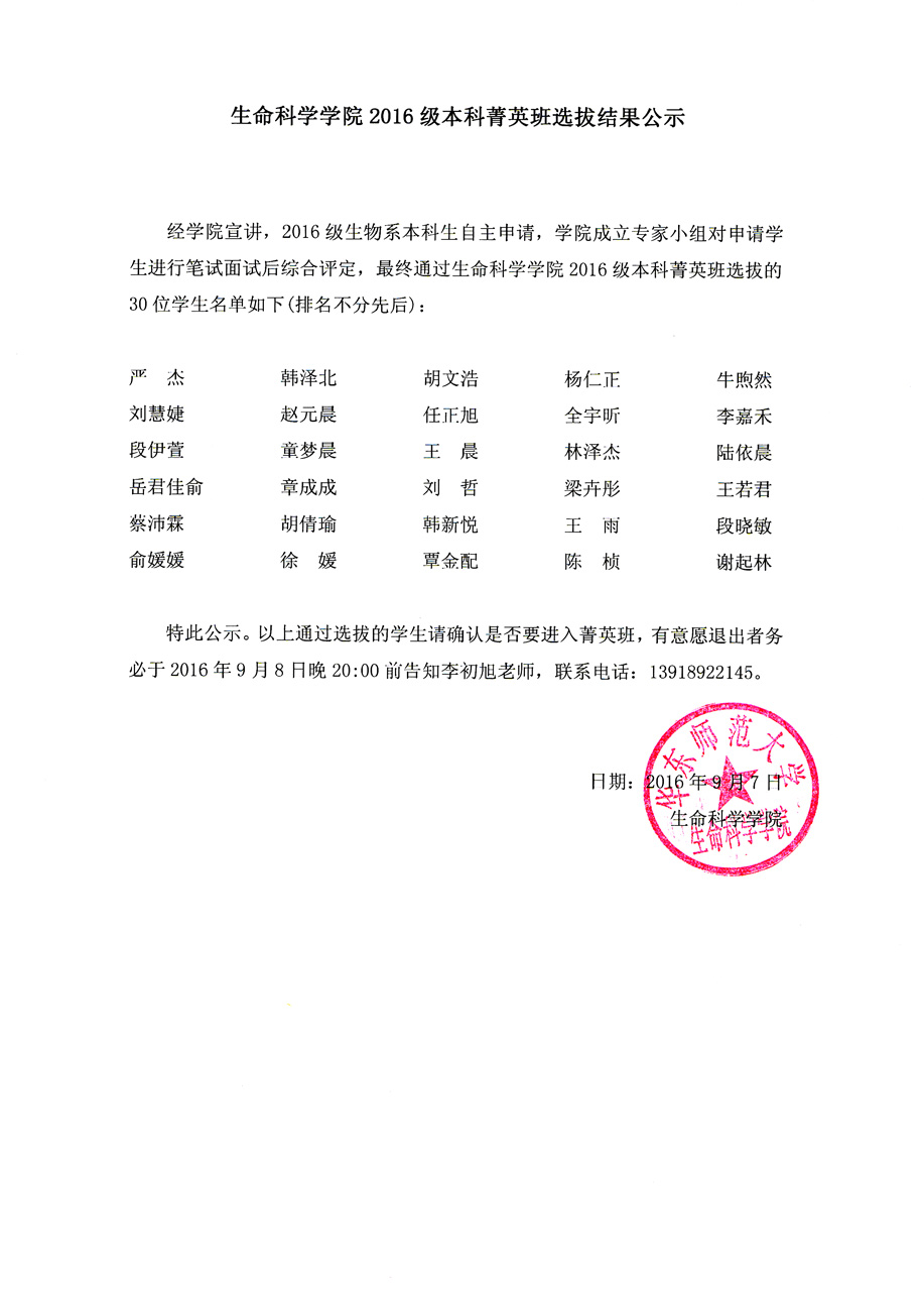 2016级生命科学学院菁英班,选拔结果通过学院官网,宣传栏以及2016级本科生通知群进行公示,公示内容如下所示: