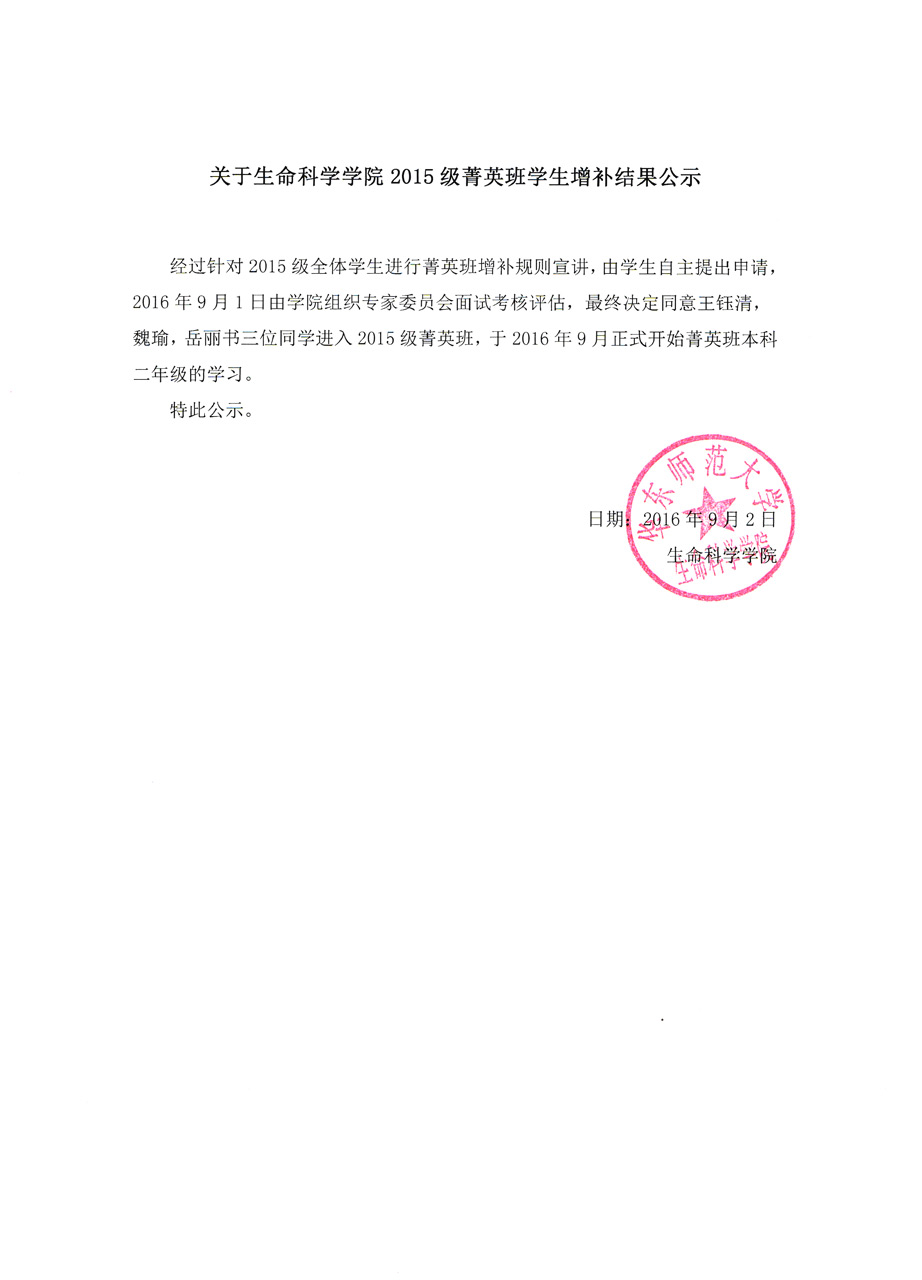经过2015-2016学年第二学期末针对全体2015级学生进行菁英班准入规则宣讲,通过年级群发布准入申请与面试通知,由学生自主提出申请,2016年9月1日由学院组织专家委员会面试考核评估,最终决定同意王钰清,魏瑜,岳丽书三位同学进入2015级菁英班,于2016年9月正式开始菁英班本科二年级的学习。将面试结果通过生命科学学院公告栏以及2015级年级群进行公示: