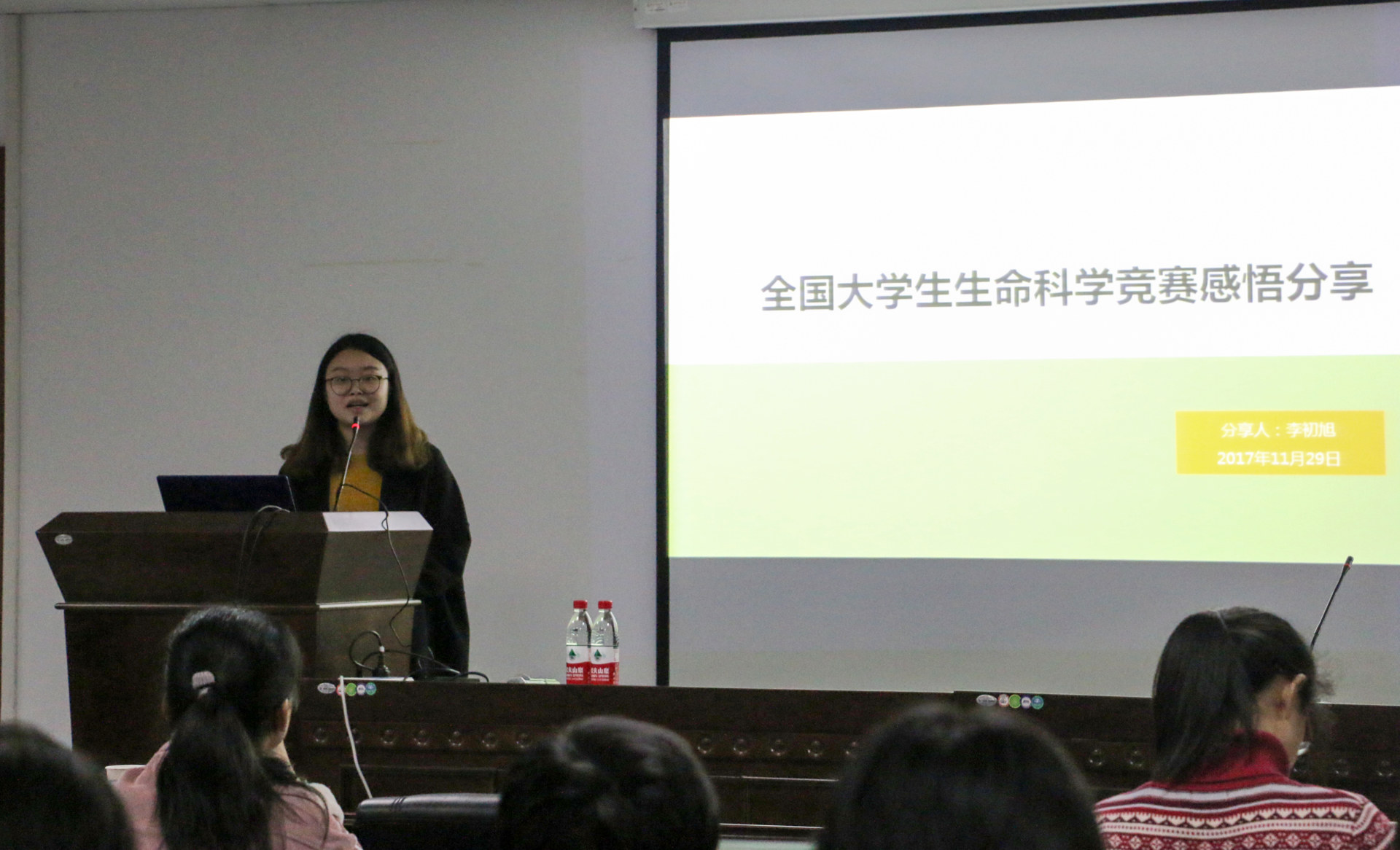 全国大学生生命科学竞赛参赛分享部分,首先领队李初旭老师从我校大学生科创体系的构成出发,着重介绍了此次全国大学生生命科学竞赛的发起与推进、第一届竞赛参与情况、竞赛目标与要求、时间安排等,并从“热情与兴趣,基础与坚持,压力与动力,挑战与磨练”四方面分享了联赛中的体验感悟。