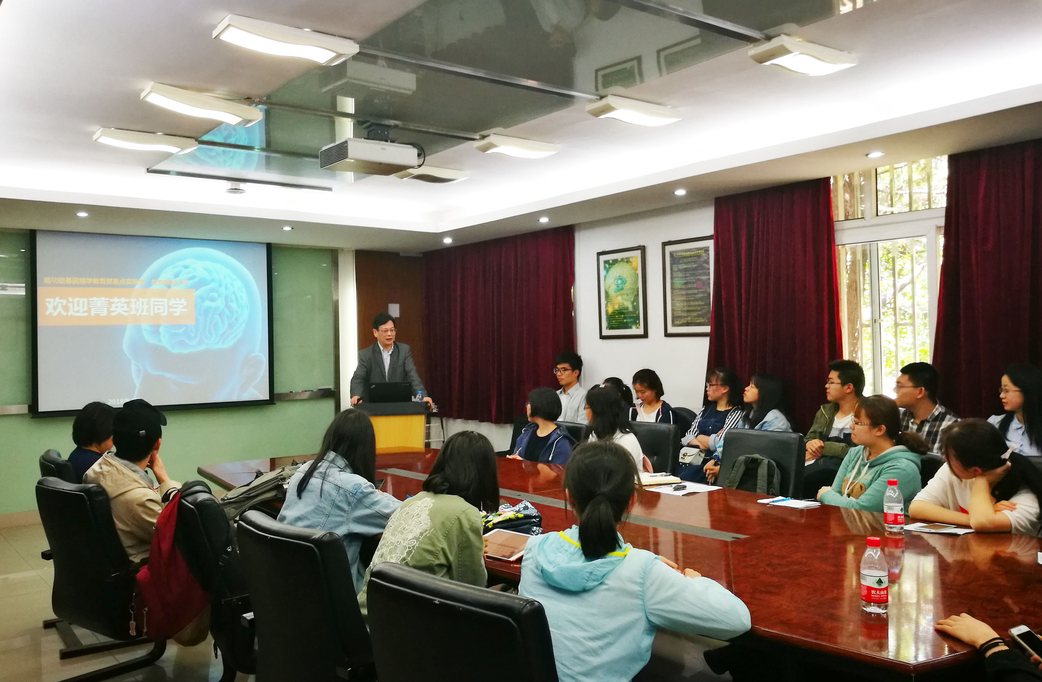 下午1点30分,菁英班的学生们到达了脑功能基因组学研究所,参观活动由林龙年教授的讲座开启,带领学生们循循探索大脑的世界。讲座开始时,林教授介绍了脑功能基因组学重点实验室的起源与发展历程。脑所最初创立自“聪明鼠之父”Pro. JoeZ. Tsien教授,现今除脑功能基因组外,还有脑网络的神经信息处理、脑环路研究共三个方向。为了让学生们更好地理解,教授以宇宙大爆炸为例,以进化的视角引入“智能”概念,为同学们厘清了神经生物学的发展脉络,最后切入如何解码大脑这个人类最后的科学谜题堡垒。林教授以自己的实验室对海马CA1区的研究为例,从HM的神奇案例到实验室中小鼠“窝概念”细胞的放电,同学们被这个全新的领域深深吸引。PPT上的视频使得老师的讲述更为生动——在多通道在体记录技术下,视频中小鼠看见形似“窝”的东西,如朝上放的盖子,“窝概念”细胞便会持续噼啪放电;而若是给小鼠吹来猫咪贴身物品上的“猫味”,对比香水、酒精、醋酸,小鼠的杏仁核会反映出长期自然选择下的恐惧放电。林教授生动细致的讲解让同学们目不转睛。讲座的最后,林教授提及美国脑计划中脑区全覆盖的概念,又将如今计算机信息编码、遗传信息编码与正在探究的大脑信息编码类比,邀学生们一同怀抱对美好未来的殷切期望。