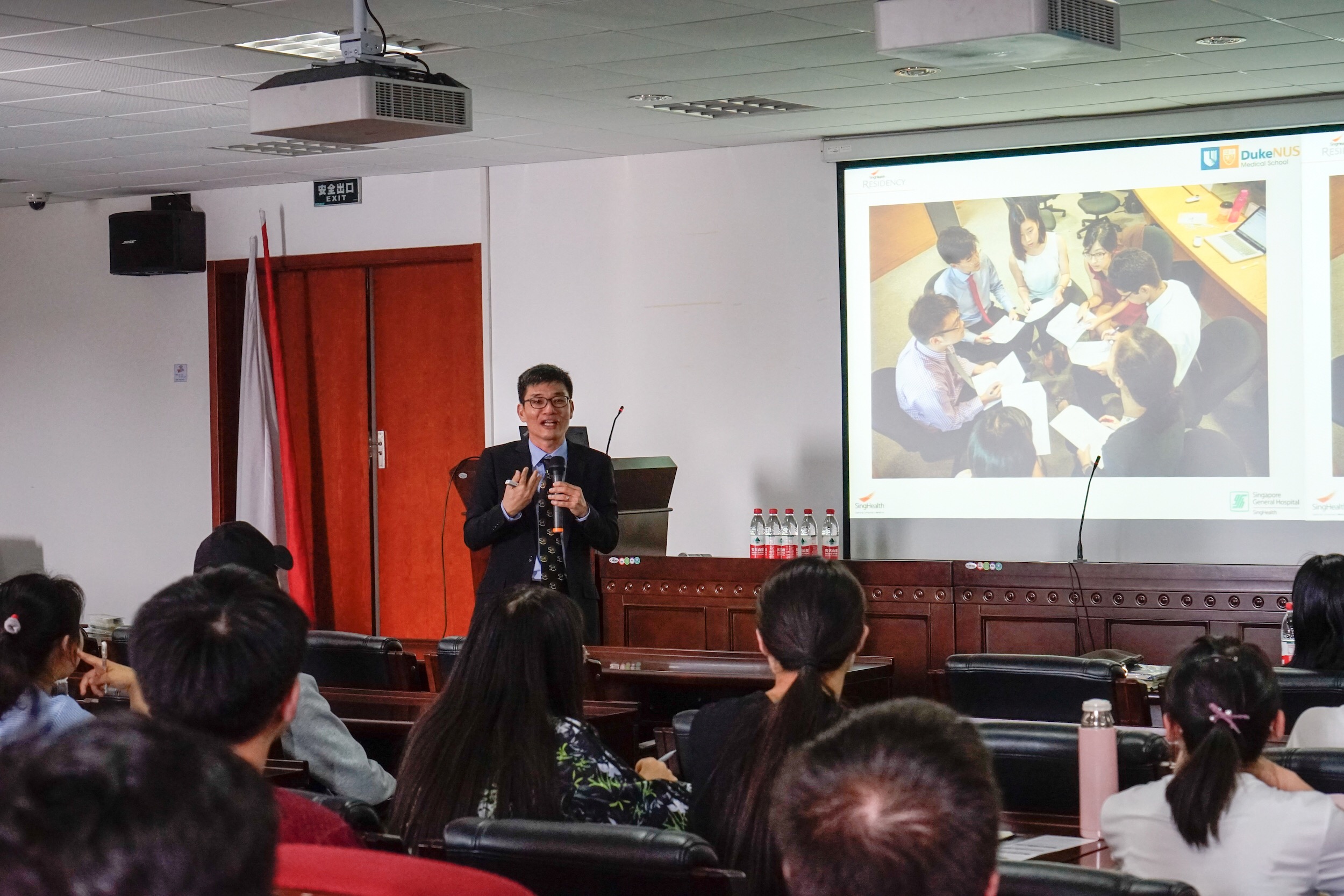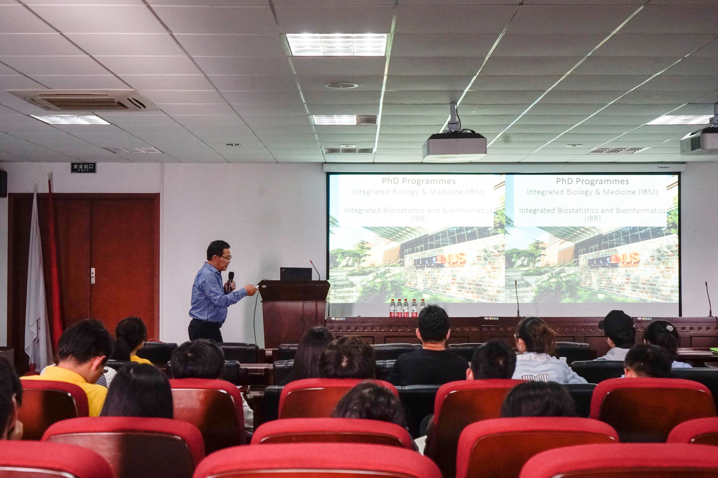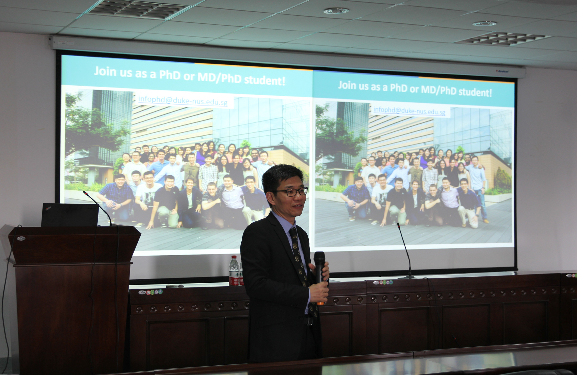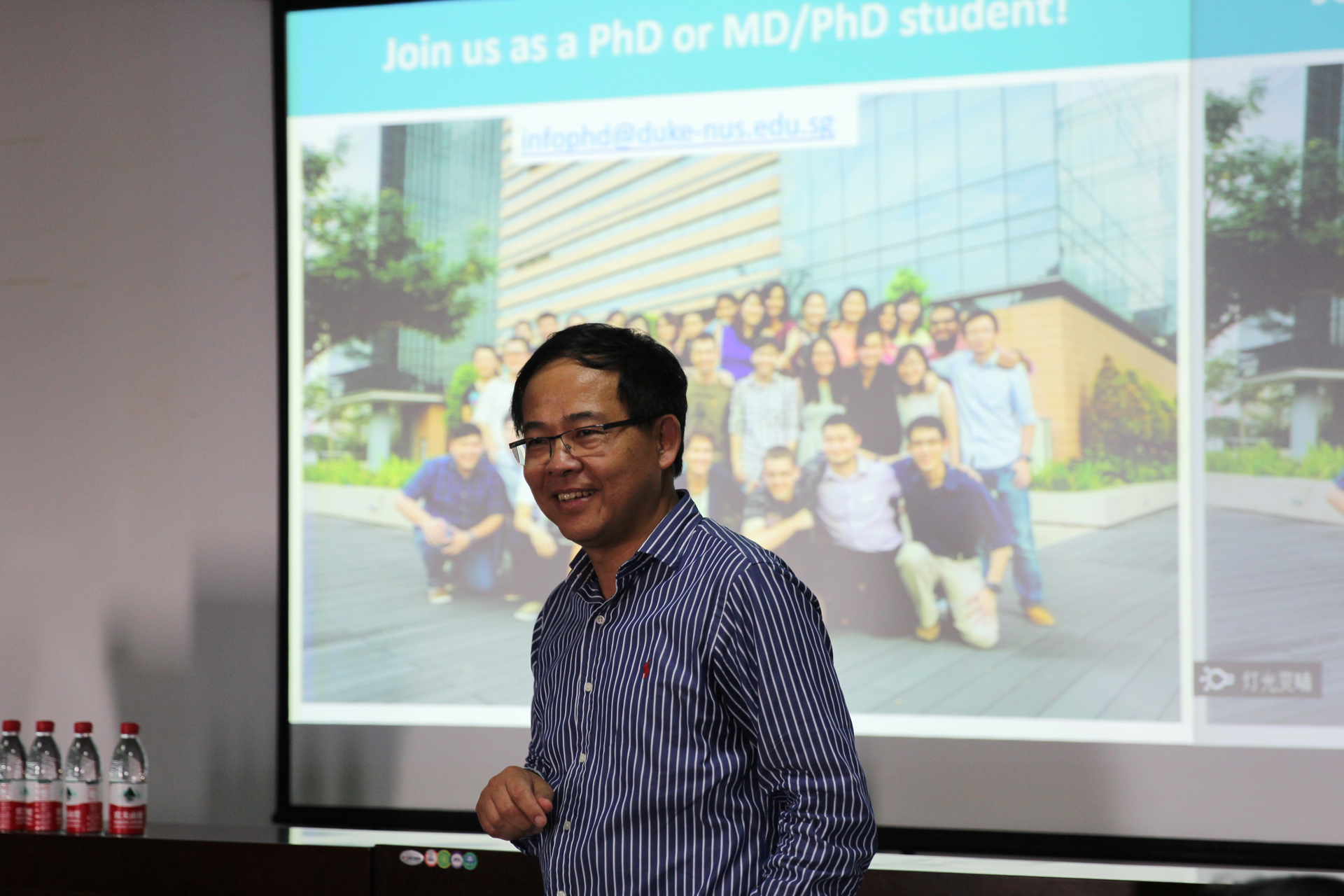 在听完对大学的介绍后,我院82届的杰出毕业生,现任新加坡Duke-NUS医学院教授,新生感染性疾病研究所所长的王林发院士热情洋溢地和我们分享了他在国外多年来的留学以及研究经历,并以自己在Duke-NUS医学院中的实验室为例,介绍了这所学校的师资力量和办学条件。他着重介绍了现在杜克-新加坡国立大学医学院的两个MD和PhD项目——IBM(Integrated Biology and Medical)和IBB(Integrated Bio-statistics and Bio-informatics)前者的项目在攻读结束后即可获得生物和医学的双学位,而后者更是新加坡一个新兴的生命医学科学计划的产物。在当前生物统计及数据分析方面的人才供不应求的时代,这个专业的开设很有利于学生的后续发展。在演讲最后,王院士也向我们发出了邀请函,以自己优秀的学生——我院的赖玉萍教授为例,希望有志于这所学校的学生也和赖老师一样勤学多思,用于发问。给自己发出挑战,让未来多一种可能性。