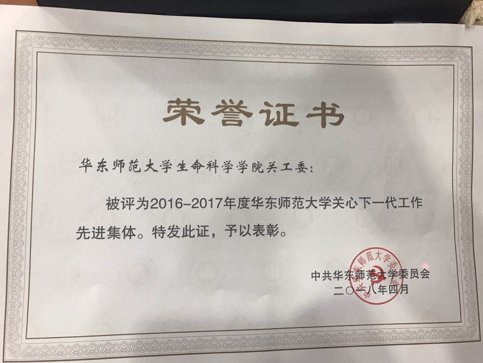 生命科学学院关心下一代工作委员会成立于2001年,近年来,在学校党委的正确领导下,在学校关工委的关怀指导下,以及在学院党政的领导关心下,始终以“关爱下一代健康成长”为己任,本着“老有所学、老有所依、老有所为、老有所乐、老有所教”的宗旨,按照“领导班子建设好、‘五老’作用发挥好、制度健全执行好、积极探索创新好、活动经常效果好”的总体要求,根据华东师范大学关工委工作要求,结合学院关工委分会的特点和学生的需求,扎实开展一系列适应新形势、富有特色且注重实效的活动,充分发挥关工委老同志在“业务上”和“做人上”的优势,扎实推进,务实创新,在助力大学生成长成才方面发挥了重要作用。