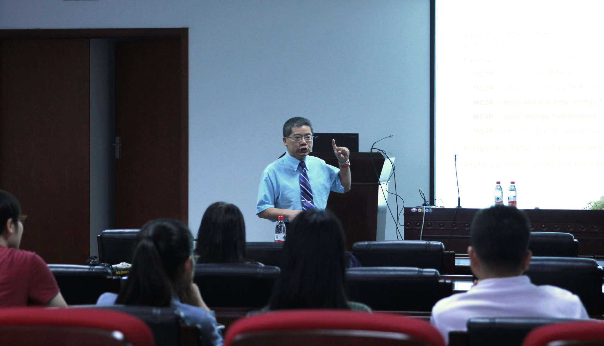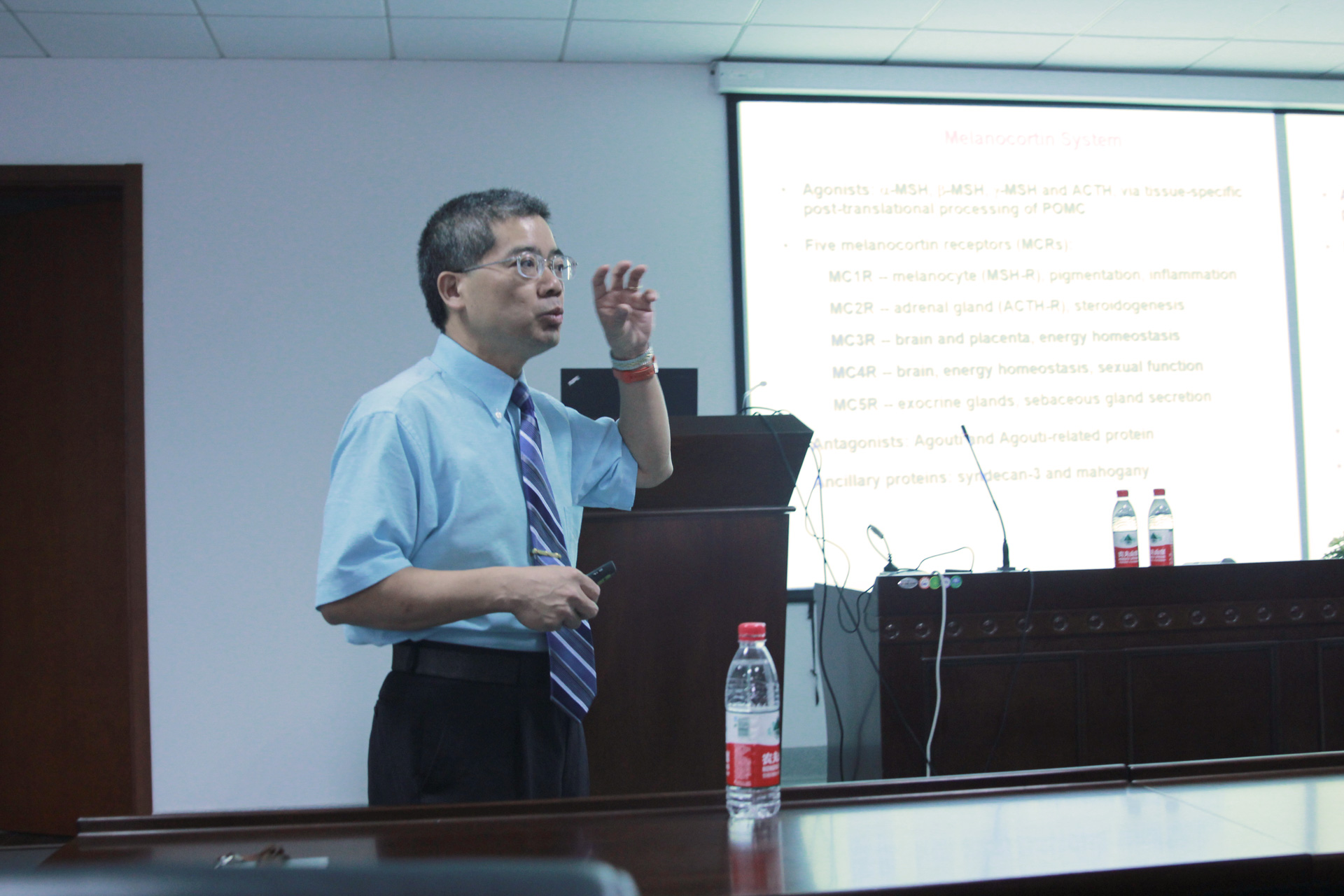 肥胖是一个不分年龄、性别、职业,更是医学、营养学及公共卫生专业人士意欲解决的一大问题,如今世界卫生组织(WHO)已确认肥胖是一种疾病,并向全世界宣布“肥胖症将是全球首要的健康问题”。本次报告中,陶教授主要介绍了影响脂肪沉积的黑素皮质素4受体的研究进展,包括受体突变的药理功能和相应治疗法,列举了一系列实验及病例证明mc4r在代谢中的重要作用,以及它发生misfold之后的不良后果,并且详细介绍了在人类MC4R不同位点的突变导致肥胖的原因。陶亚雄教授的研究团队在国际上首次用药物伴侣诱导受体分子成熟,使其转运到细胞表面并对激动剂产生反应,促进第二信使产生。最后陶亚雄教授报告还将人、猪和猫受体的结构和功能的系统比较和关系,介绍了MC4R的自然突变在洞穴鱼进化中适应低营养物质环境的重要性,以及人类和鱼的MC4R的异同。精彩的报告深深吸引了在座的各位老师和同学,拓宽了研究视野,并就感兴趣的问题与陶教授展开了热烈的探讨,取得了良好的学术交流效果。