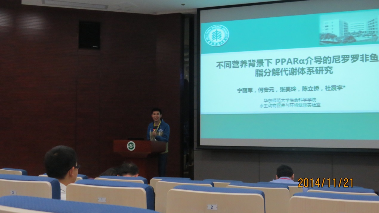 我校生科院杜震宇教授应邀出席此次大会,并作为主持人主持了动物学会水产动物研究论坛。杜震宇教授还在本次大会分会场论坛上做了《鱼类脂肪组织的核磁成像研究》主题报告,向诸多代表报告了其课题组新近利用核磁成像(MRI)技术对不同食性、体型鱼类体内脂肪组织的形状、分布和体积进行定量描述和比较的工作。借助此技术,杜震宇课题组首次在国际上建立了鱼类脂肪组织的数字化3D模型,并首次阐明鱼类脂肪组织在不同种鱼类体内分布的种属多样性特征,这为鱼类脂代谢研究提供了一种新的研究视角。此外,杜震宇教授的博士生宁丽军同学获得了大会优秀博士参会资助,并在博士生论坛做了题为《不同营养背景下 PPARα介导的尼罗罗非鱼脂分解代谢体系研究》的报告。在此报告中,宁丽军同学向参会代表报告了其利用罗非鱼作为模型鱼类,通过设计不同营养策略和靶向药物,对鱼类中由PPARα介导的脂类分解代谢体系进行深入研究的工作成果。该工作首次在国际上阐明,鱼类PPARα的效能激活与其营养背景密切相关,这部分解释了之前国际鱼类学界关于“鱼类PPARα是否能被有效激活”的普遍疑问,具有很高的学术价值。经评委专家评选,宁丽军博士的报告获得本次大会博士生论坛的优秀报告奖。
