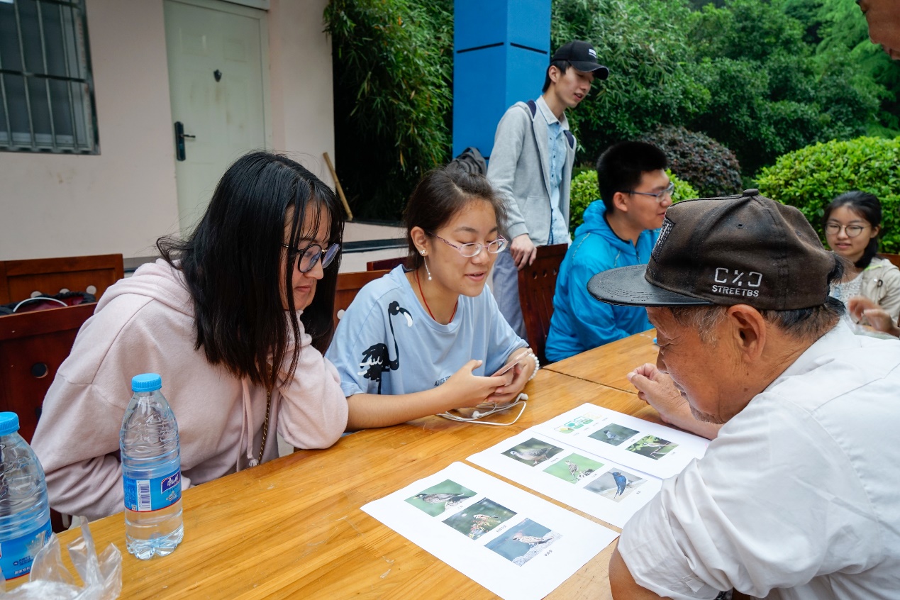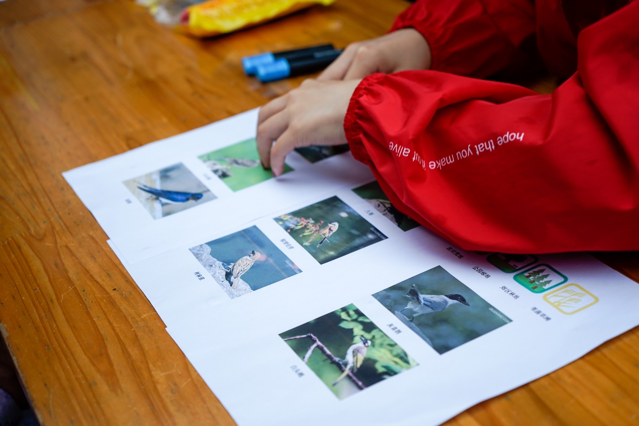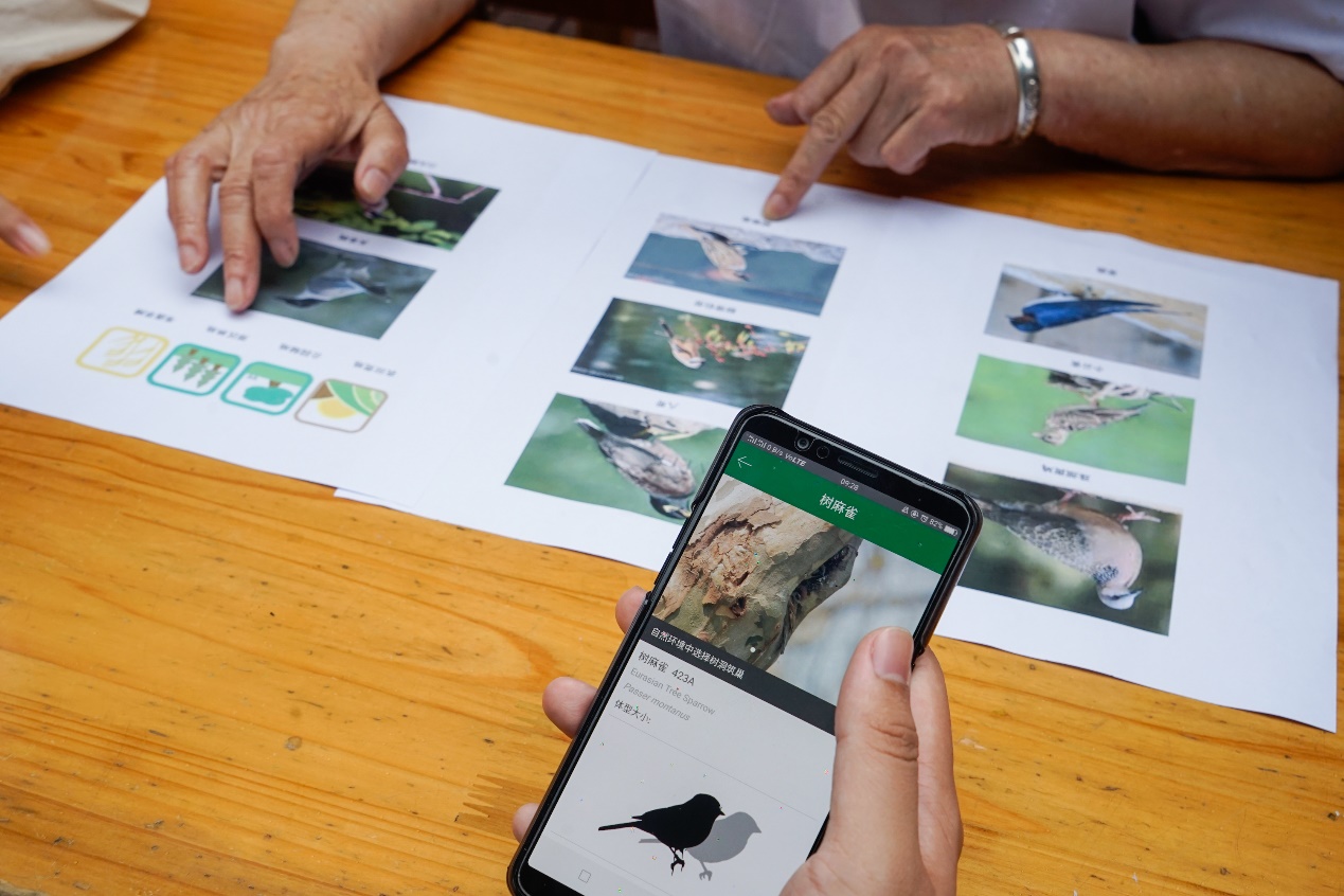 在“听声识鸟”的活动中,负责同学首先会播放不同鸟的叫声,居民可根据自己感兴趣的叫声站队,由负责同学对此种鸟类进行进一步的详细介绍。悦耳的鸟叫声着实吸引了许多居民来参加活动呢!