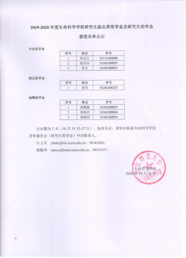 2019-2020年度生命科学学院研究生励志类奖学金及研究生助学金获奖名单公示