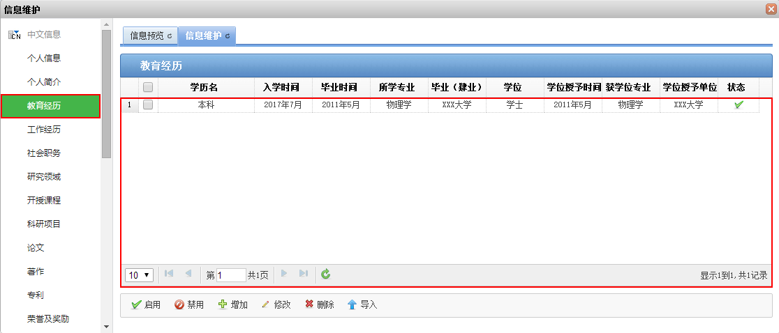 系统将该类型“信息项”的各条信息以表格的形式展示在“教师个人页”中,您可根据需要添加多条信息。
