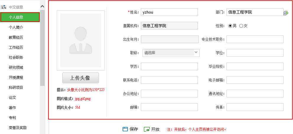 页面左侧展示的即为您可选择维护的个人“信息项”(中英文),例如:个人信息、研究方向、教学工作、荣誉奖励等。单击选择各“信息项”后,页面右侧即展示该“信息项”内容的编辑页面。