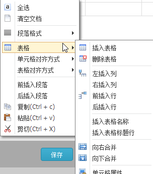 | 插入表格。你可在下拉框中选择插入一个M行N列的表格。 完成表格插入后,在编辑区域中选中该表格,单击鼠标右键,即可在右键菜单中选择对表格的相关属性进行设置,如下图所示。