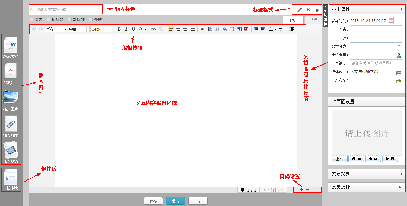 您可在文章编辑框中根据页面提示编辑文章内容、设置文章属性等,编辑框中编辑按钮的作用同上文,可参见表 1-1。完成文章编辑后可选择将文章保存为“草稿”或直接选择“发布”。