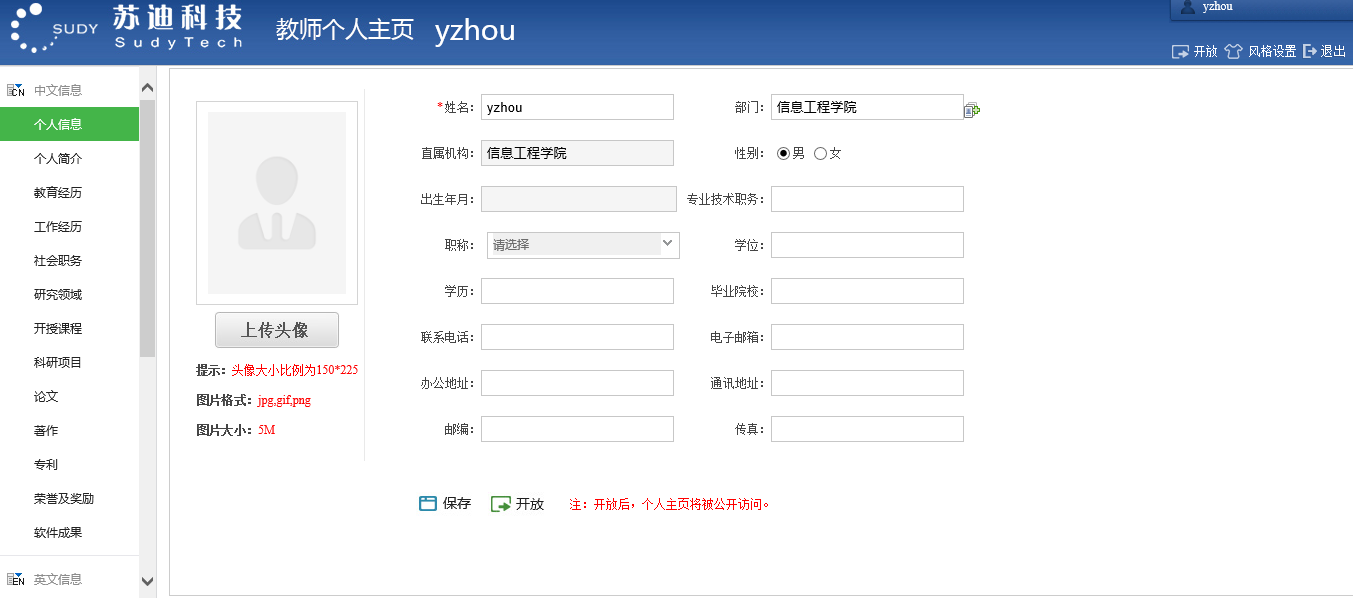 系统开放了相关入口,供教师自行维护本人的“教师个人页”所展示的所有信息。例如:个人基本信息、科研方向、学术成果、社会兼职等。