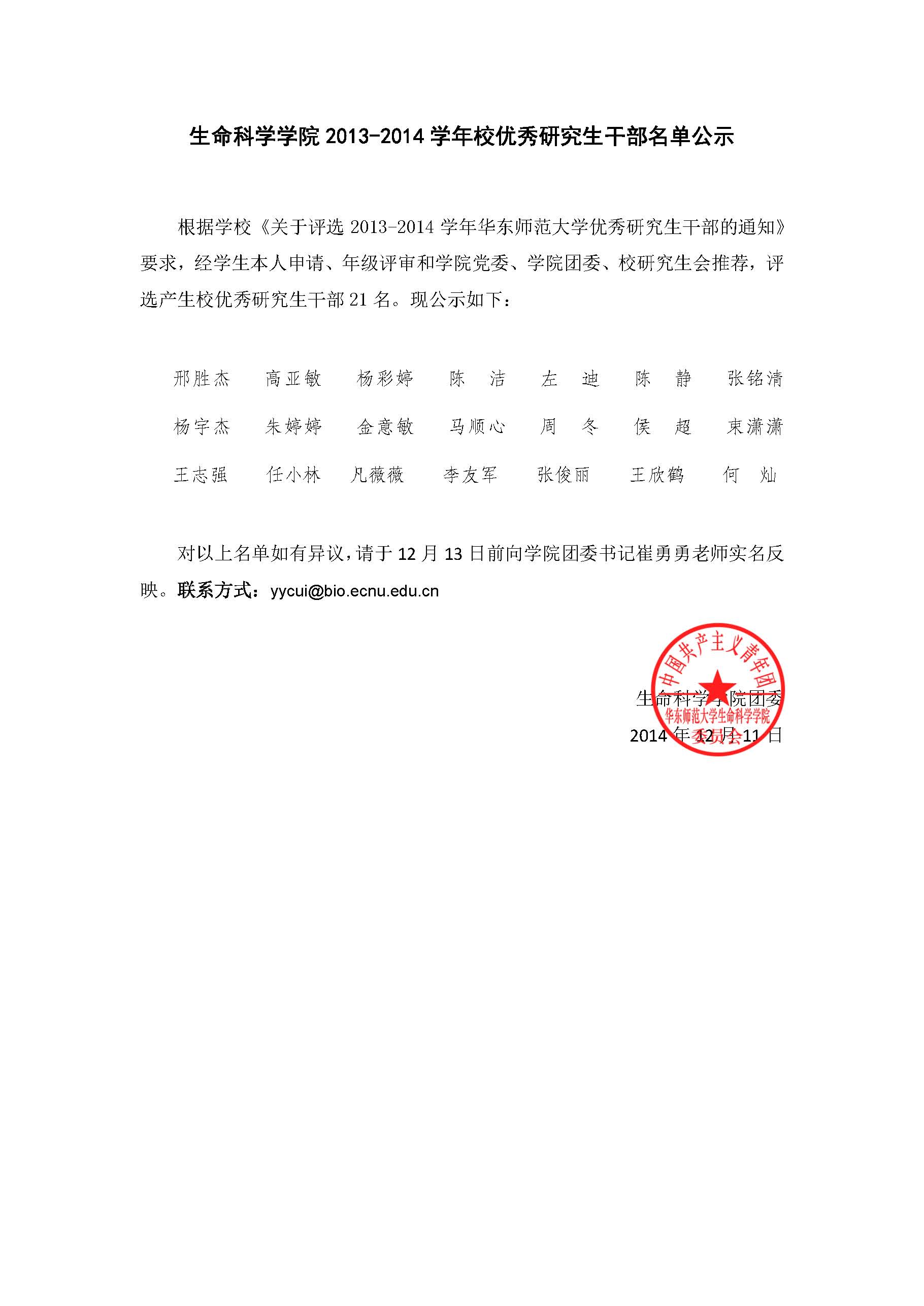 生命科学学院2013-2014学年校优秀研究生干部名单公示